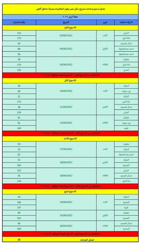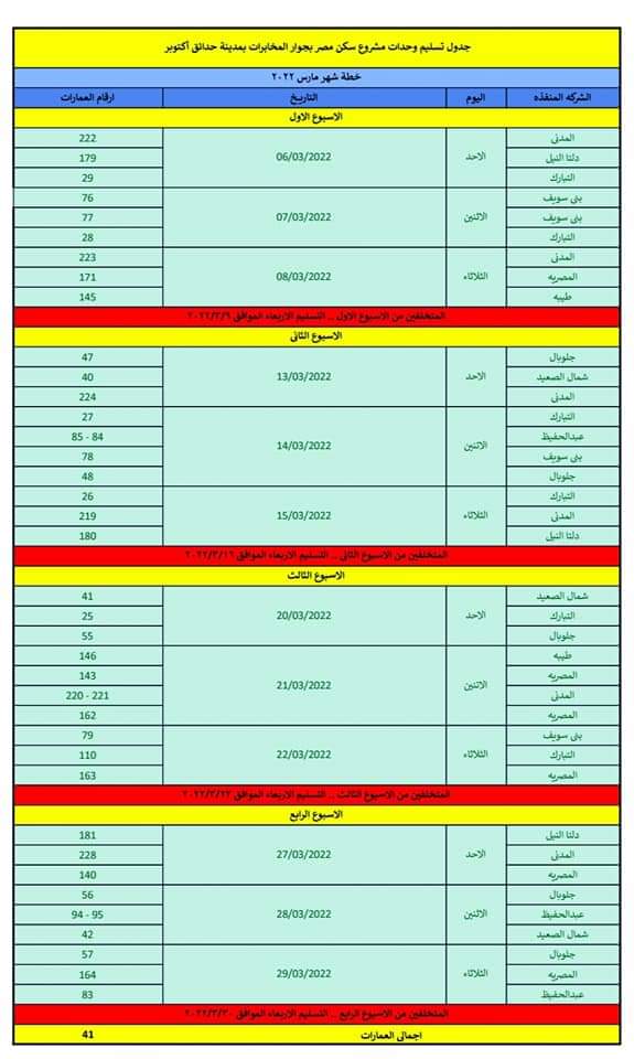 أعلنت هيئة المجتمعات العمرانية بوزارة الإسكان البدء في تسليم المرحلة الرابعة لشقق مشروع سكن مصر للمواطنين الحاجزين بإجمالي ٣٨٨٨ وحدة سكنية بجوار الداون تاون بمدينة حدائق أكتوبر بدءًا من الأحد المقبل ٢/١/٢٠٢٢ وحتى الأربعاء ٢٥/٥/٢٠٢٢.