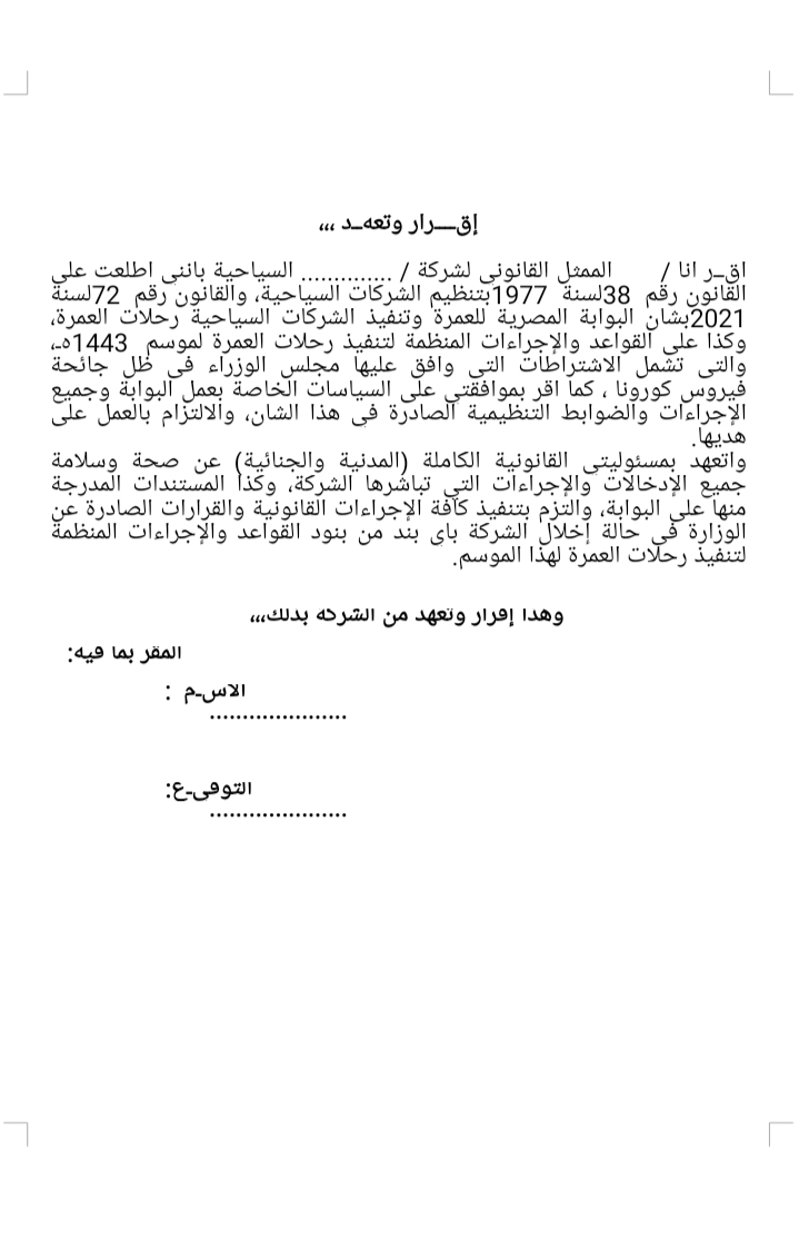 ألزمت وزارة السياحة والآثار، الشركات السياحية بإرفاق تعهد ضمن مستندات توثيق عقد وكالة العمرة لهذا الموسم، وتتولى غرفة شركات ووكالات السفر والسياحة إدراج هذا الإقرار على البوابة.