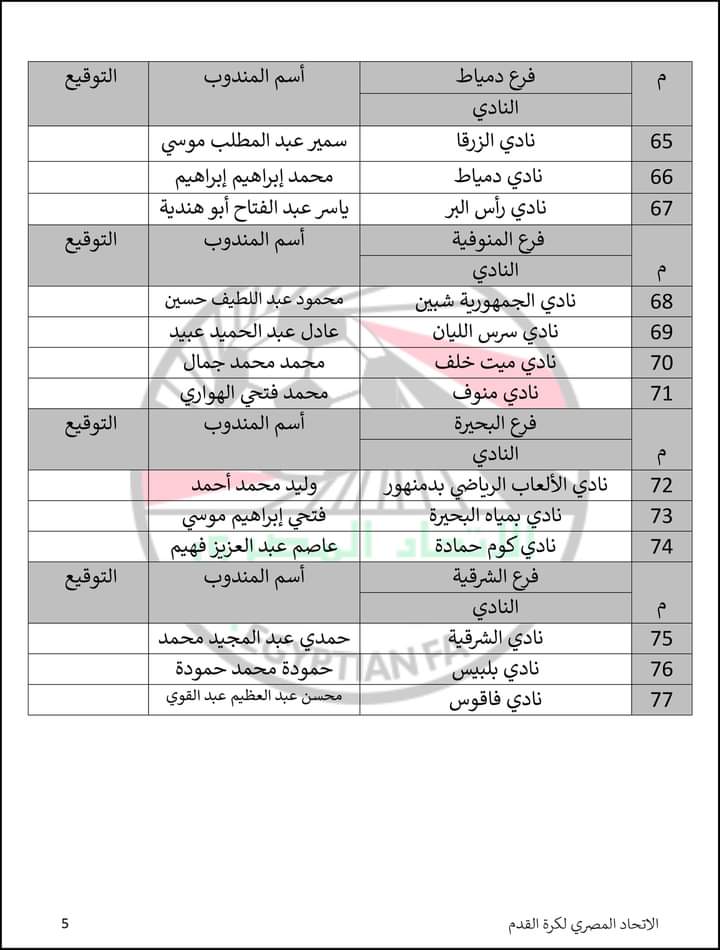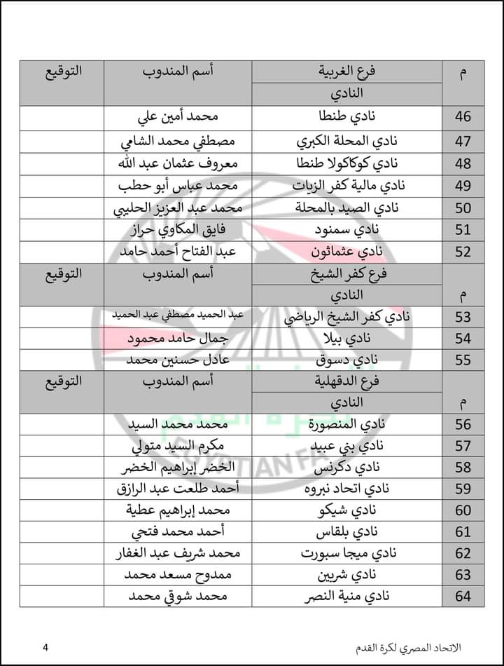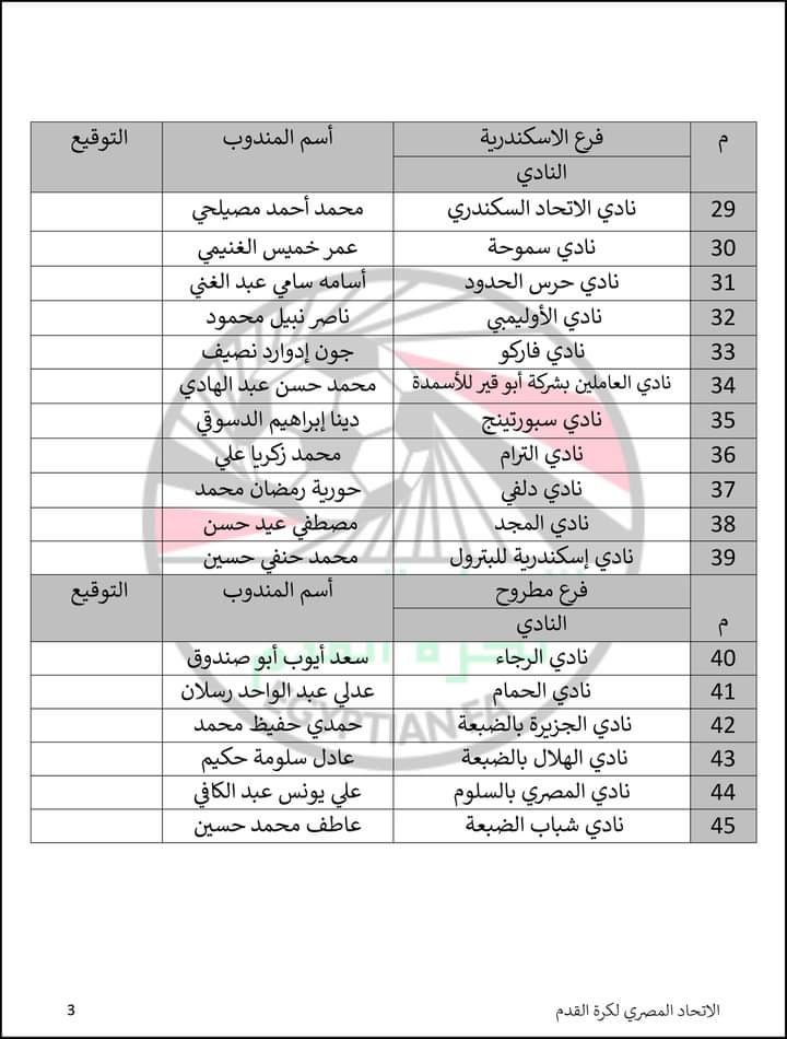 أعلن الاتحاد المصري لكرة القدم قائمة بأسماء مندوبي الأندية أعضاء الجمعية العمومية المقرر انعقادها يوم الأربعاء المقبل وفق ما وصل للاتحاد رسميًا من 124 ناديا من بين 129 تشكل القوام الحالي للجمعية.