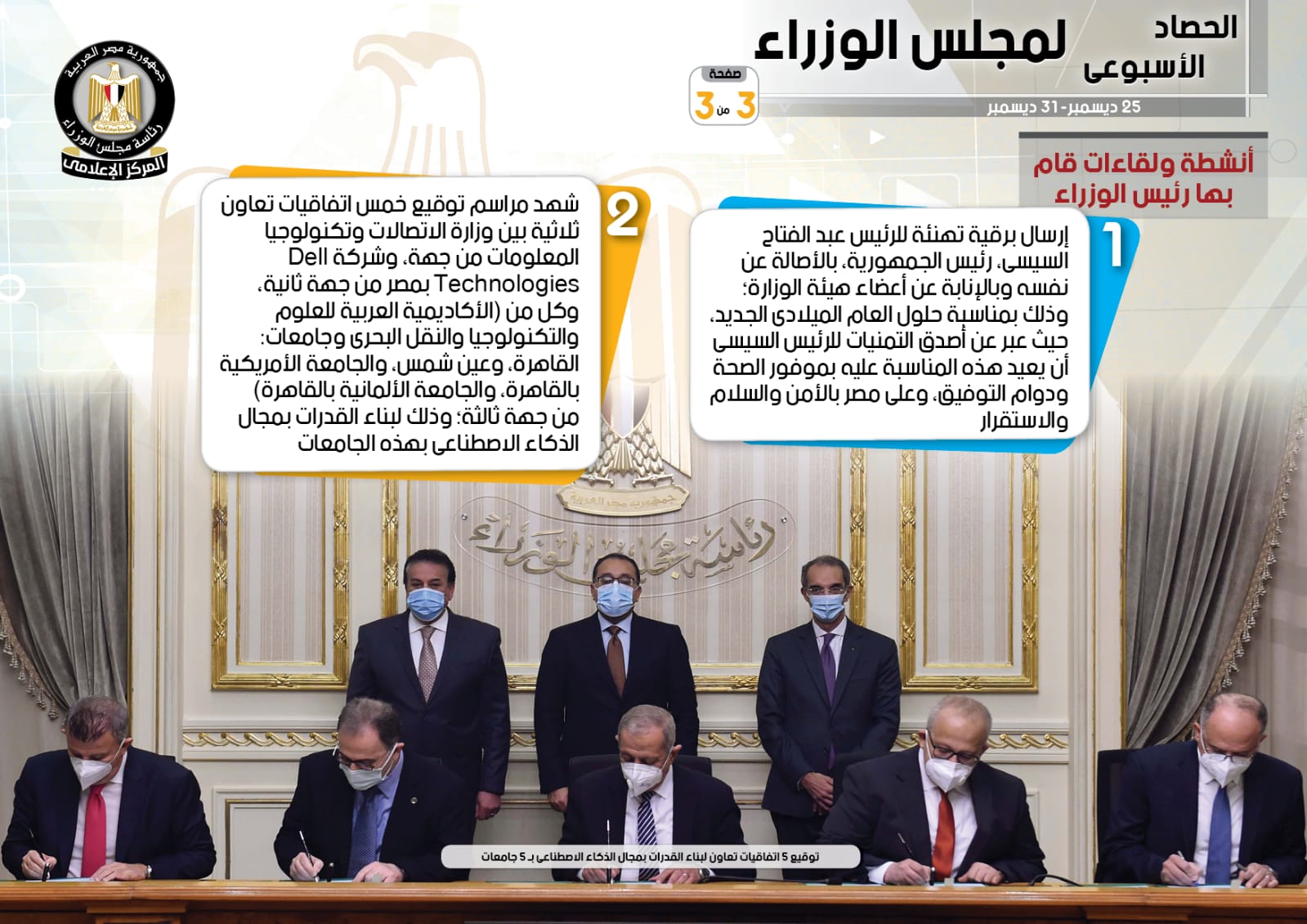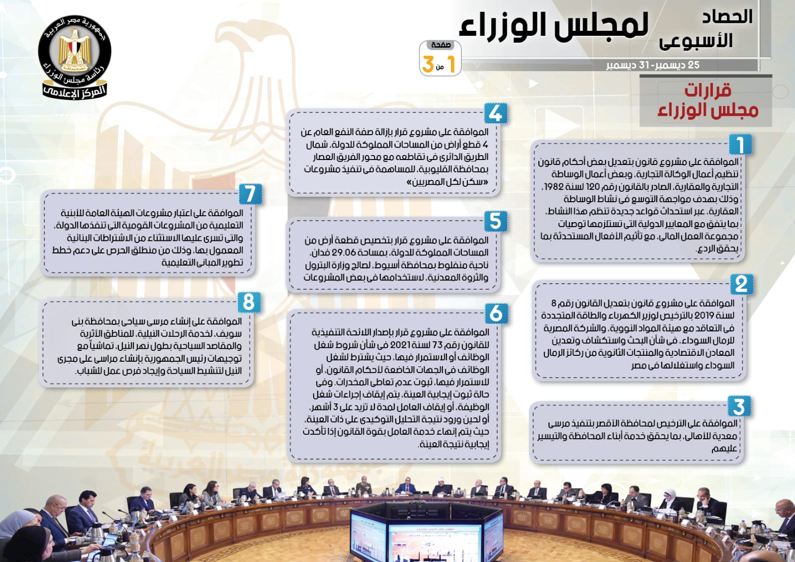 نشر المركز الإعلامي لمجلس الوزراء، تقريرًا شمل إنفوجرافات سلط من خلالها الضوء على الحصاد الأسبوعي لمجلس الوزراء، وذلك خلال الفترة من 25 حتى 31 ديسمبر 2021، والذي تضمن الموافقة على عدد من القرارات، فضلًا عن الاجتماعات التي عقدها الدكتور مصطفى مدبولي، رئيس مجلس الوزراء، بالإضافة إلى ما قام به من أنشطة.