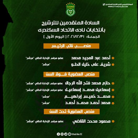 انتهي اليوم الأول من باب التقدم لانتخابات نادي الاتحاد السكندري التي ستُجرى خلال الجمعية العمومية المقرر انعقادها يوم الجمعة 25-2-2022 بمقر النادي لاختيار مجلس إدارة جديد.