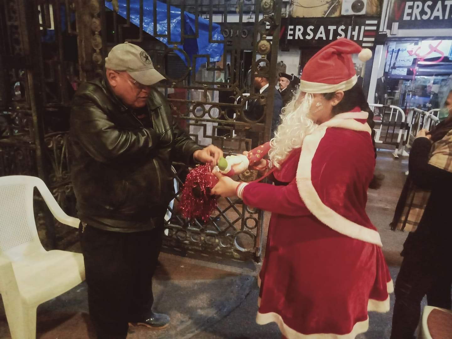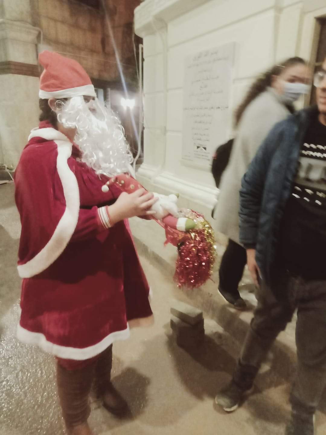 فى لقطة جديدة ومع ساعات قليلة من انطلاق العام الجديد، وقفت الفتاة "كيرمينالس" ترتدي زي بابا نويل، تقدم الحلوى والهدايا للوافدين على الكنيسة المرقسية بمنطقة محطة الرمل، لحضور قداس رأس السنة الذي يترأسه البابا تواضروس الثاني، بابا الإسكندرية وبطريرك الكرازة المرقسية.