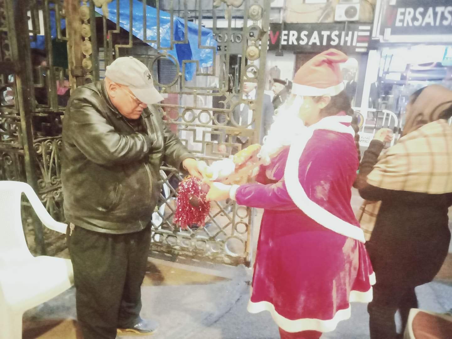 بملابس بابا نويل.. فتاة توزع الحلوى بالكنيسة المرقسية فى الإسكندرية