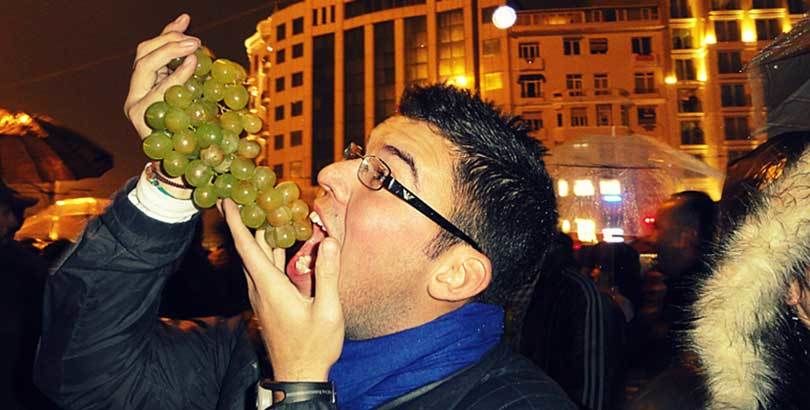 وفي إسبانيا، فيتناول السكان 12 حبة عنب في آخر 12 ثانية من منتصف آخر ليلة في العام الماضي وذلك اعتقادًا منهم أن هذا التصرف يجلب لهم الحظ السعيد ويبعد عنهم الأرواح الشريرة فإذا لم يتمكن الشخص من تناول حبات العنب جميعًا يعتبر هذا في إسبانيا نذير شؤم حيث ترمز كل حبة عنب عن شهر من شهور السنة.