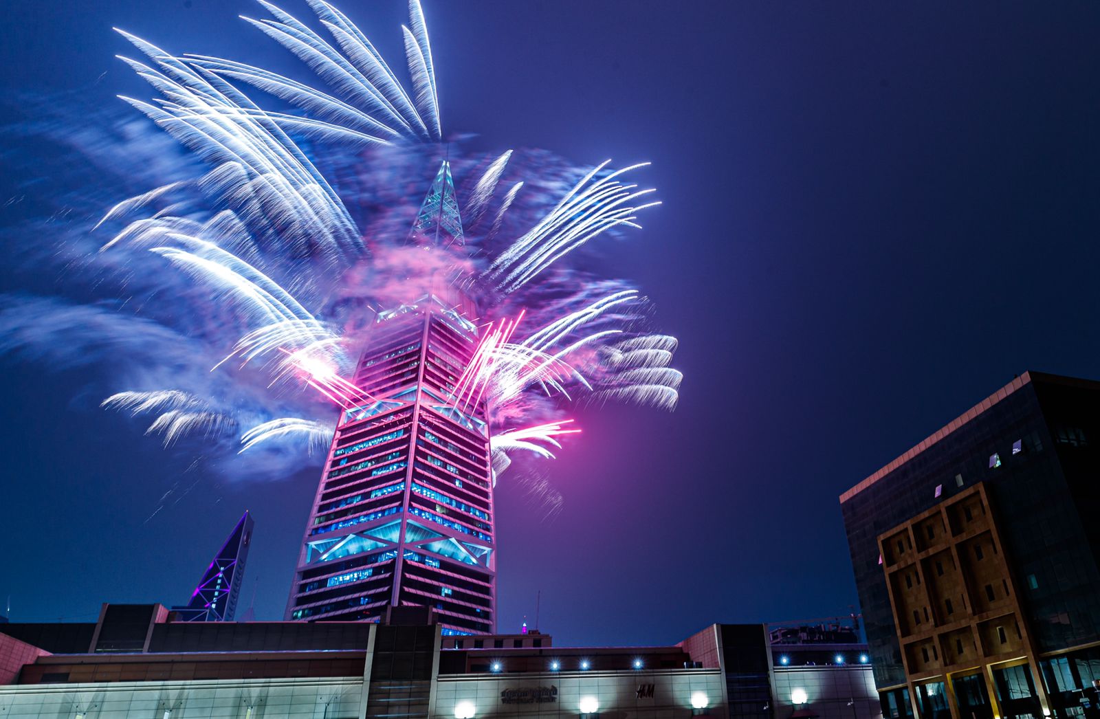 وانطلقت الألعاب النارية مع بدء العام الجديد، كما ارتفعت الإشارات المضيئة في سماء العاصمة الرياض إيذانًا ببدء 2022.