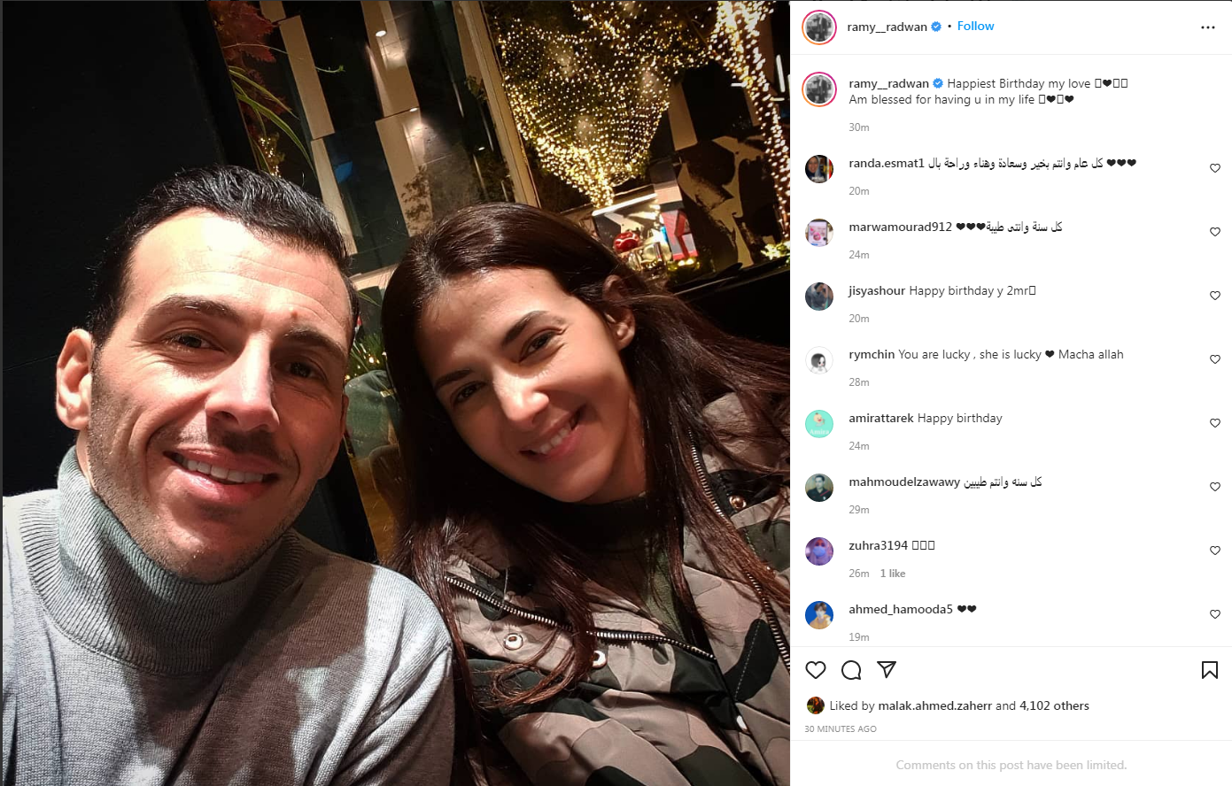 ونشر رامي رضوان صورة له رفقة زوجته معلقًا عليها قائلا: "أسعد عيد ميلاد يا حبيبتي.. أنا محظوظ لوجودك في حياتي".