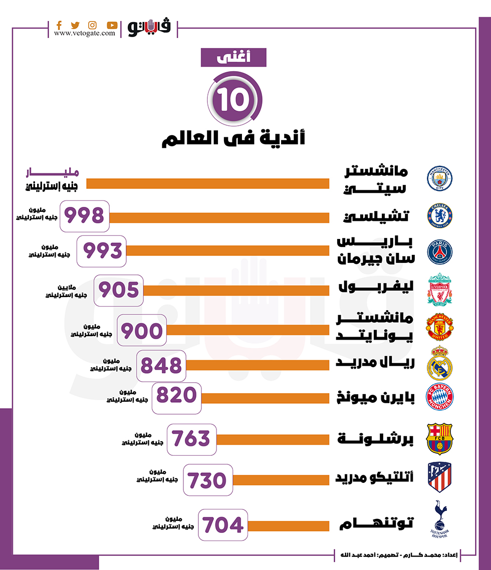 أغنى 10 أندية فى العالم| انفوجراف الأحد 02/يناير/2022 - 09:18 م 1/2/2022 9:18:10 PM ليفربول محمد كارم شارك طباعة 18 حجم الخط شارك طباعة مانشستر سيتي مانشستر يونايتد ليفربول باريس برشلونة باريس سان جيرمان