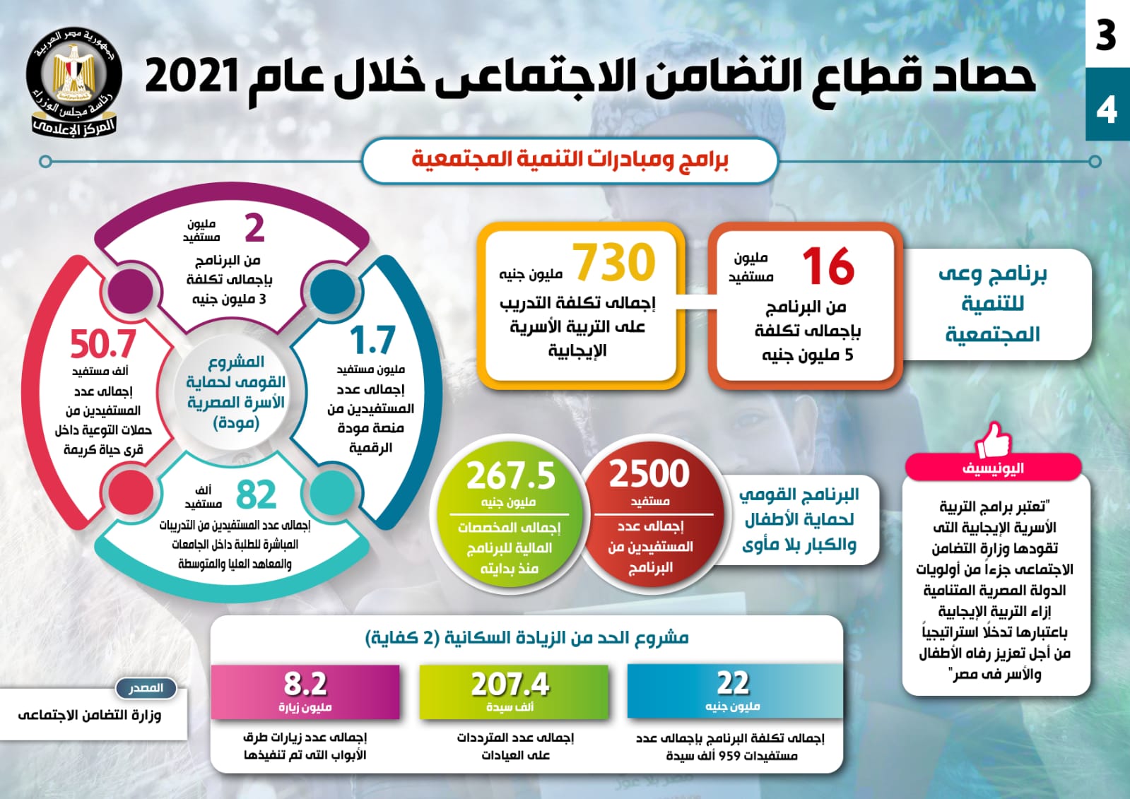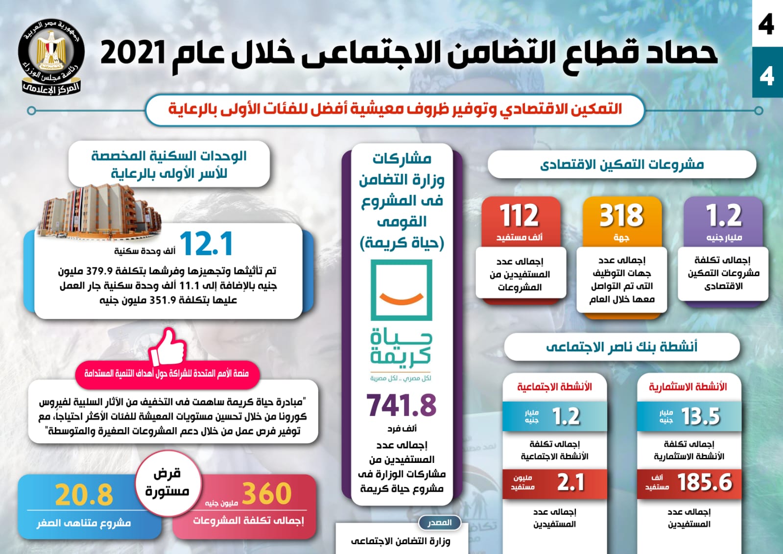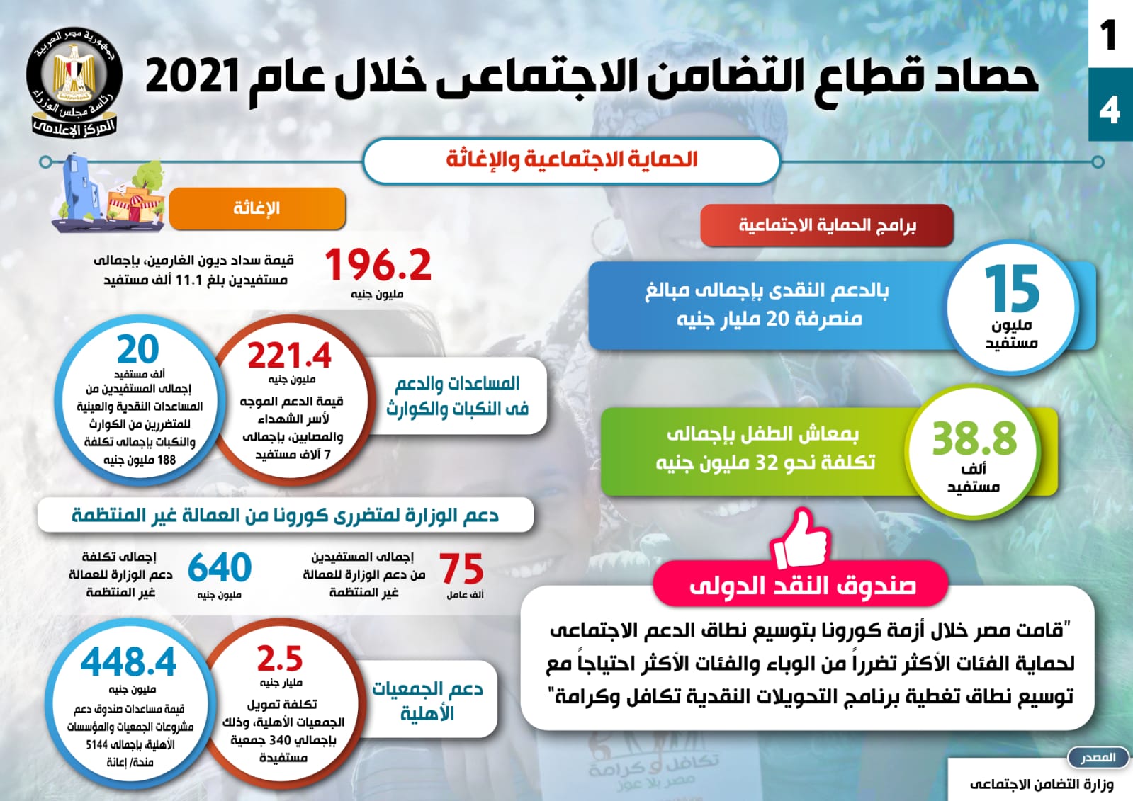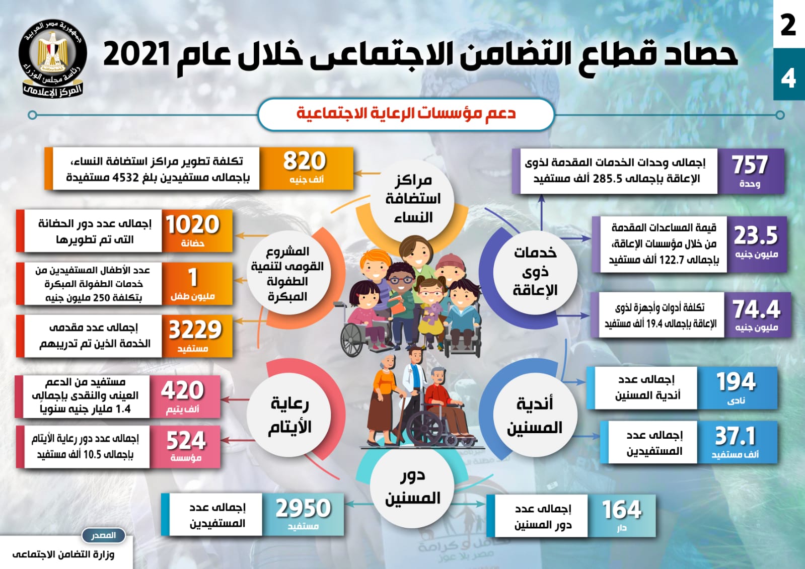 وفي إطار سلسلة تقارير حصاد قطاعات الدولة في عام 2021، نشر المركز الإعلامي لمجلس الوزراء تقريرًا تضمن إنفو جرافات تسلط الضوء على حصاد قطاع التضامن الاجتماعي.