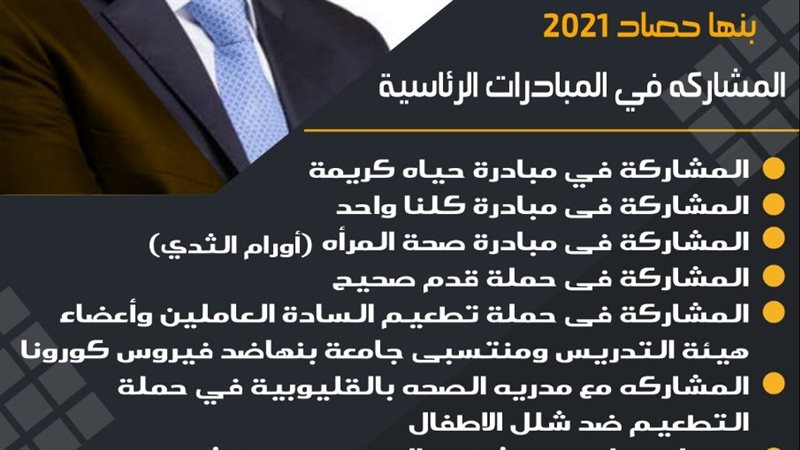 قدمت مستشفى بنها الجامعي حصادها لعام 2021 برعاية والدكتور جمال سوسة رئيس جامعة بنها والدكتور محمد الأشهب عميد الكلية ورئيس مجلس إدارة المستشفيات والدكتور عمرو الدخاخني المدير التنفيذي لمستشفيات جامعة بنها والدكتور محمد شاكر مدير المستشفى والطاقم الاداري.