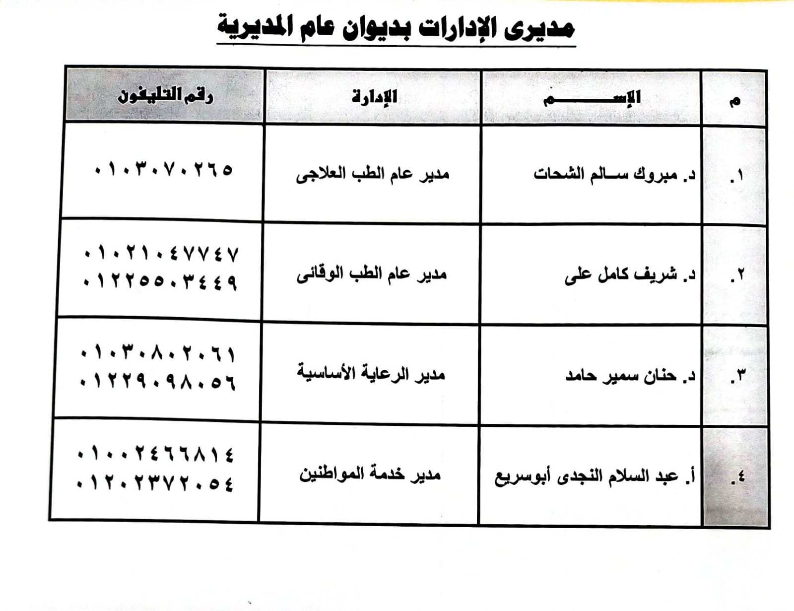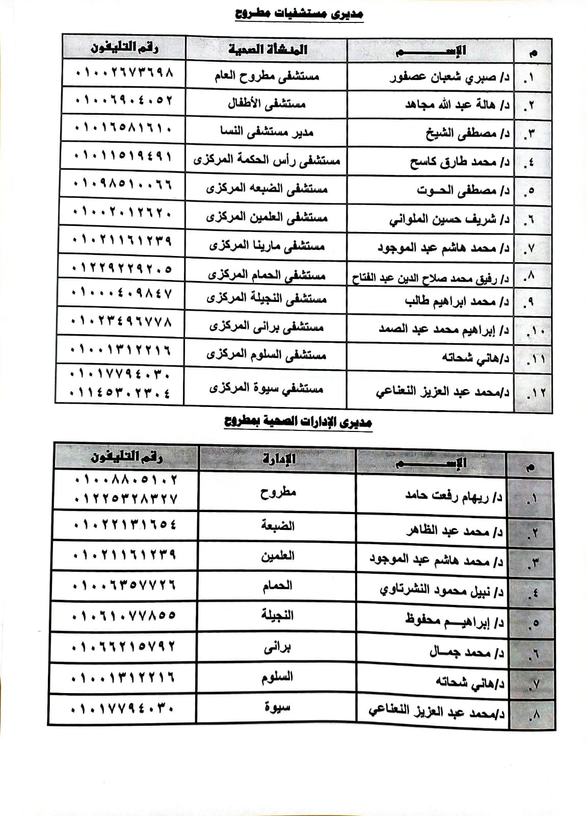 صحة مطروح تنشر أرقام مديري المستشفيات والإدارات لخدمة المواطنين