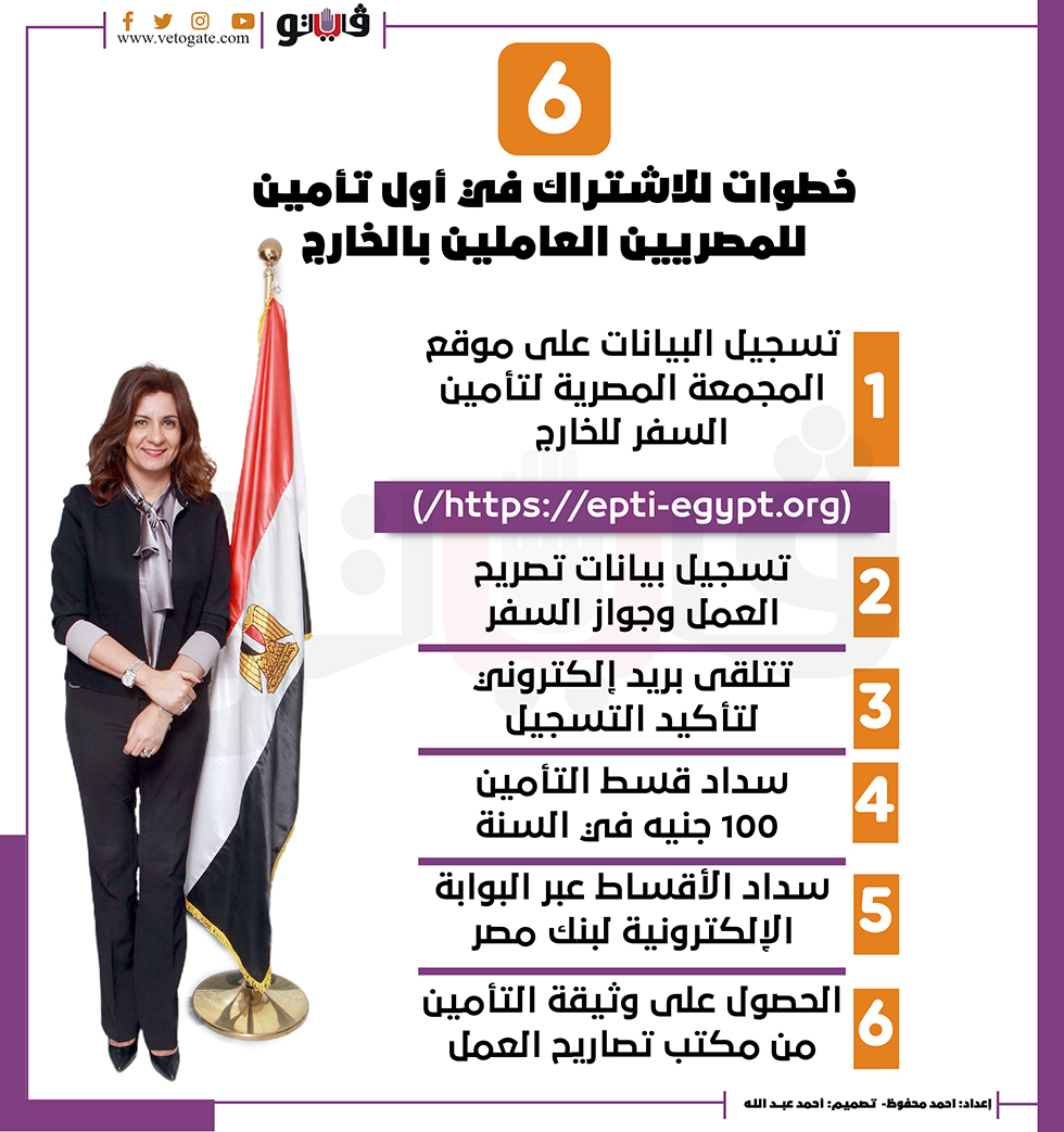 6 خطوات للاشتراك في أول تأمين للمصريين العاملين بالخارج|إنفوجراف السبت 01/يناير/2022 - 05:05 م 1/1/2022 5:05:34 PM السفيرة نبيلة مكرم وزيرة الهجرة أحمد عبدالمحسن شارك طباعة 18 حجم الخط شارك طباعة المصريين بالخارج بنك مصر المنصة الالكترونية السفر للخارج البيانات الشخصية البوابة الالكترونية تامين السفر للخارج المقيمين بالخارج