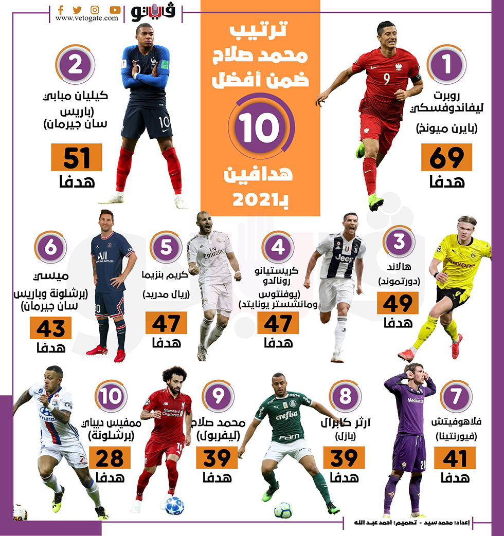 ترتيب محمد صلاح ضمن أفضل 10 هدافين بـ2021 | انفوجراف الأحد 02/يناير/2022 - 01:24 م 1/2/2022 1:24:32 PM محمد صلاح محمد سيد شارك طباعة 18 حجم الخط شارك طباعة ليفربول محمد صلاح كريستيانو رونالدو رونالدو كيليان مبابي هالاند ميسي