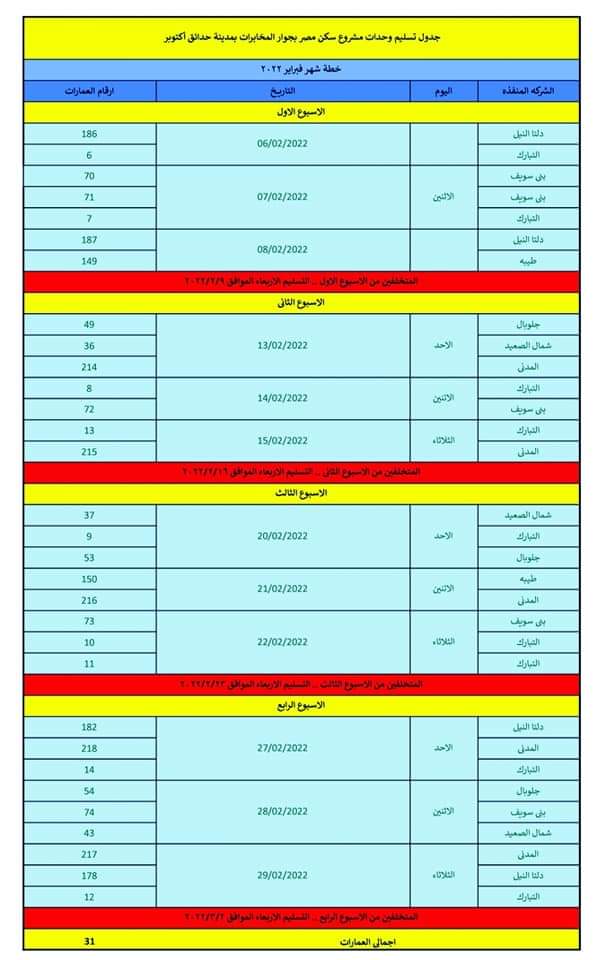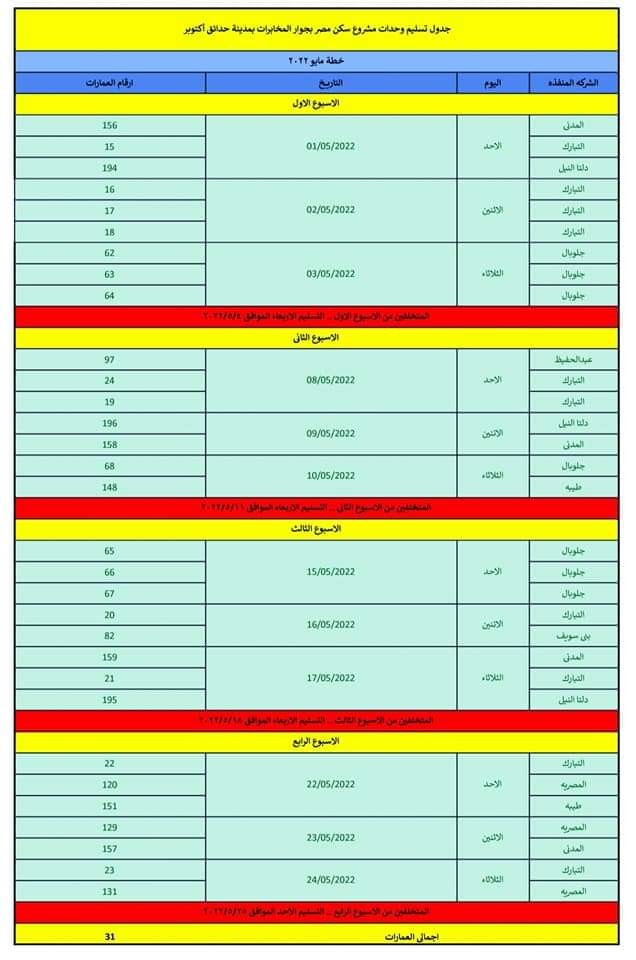 أعلنت هيئة المجتمعات العمرانية بوزارة الإسكان البدء في تسليم المرحلة الرابعة لشقق مشروع سكن مصر للمواطنين الحاجزين بإجمالي ٣٨٨٨ وحدة سكنية بجوار الداون تاون بمدينة حدائق أكتوبر بدءًا من الأحد المقبل ٢/١/٢٠٢٢ حتى الأربعاء ٢٥/٥/٢٠٢٢.