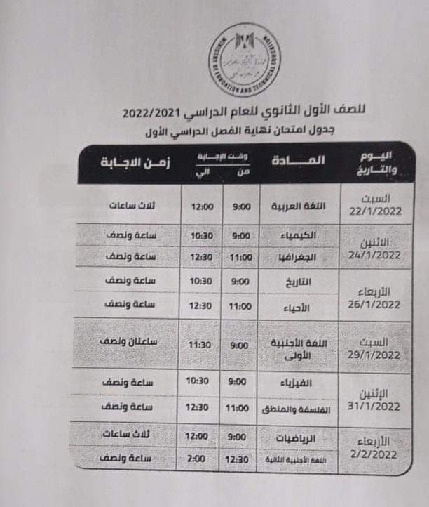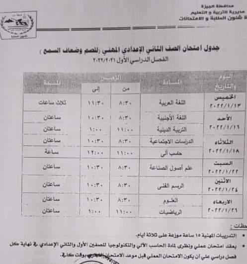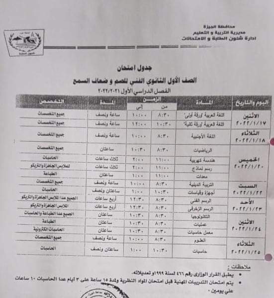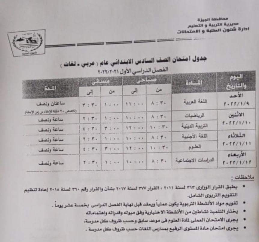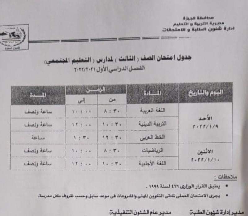 وكان اللواء أحمد راشد محافظ الجيزة ومجدى الجيار مدير مديرية التربية والتعليم بالجيزة اعتمدا جداول امتحانات الفصل الدراسى الأول "نصف العام" للعام الدراسي 2021/2022 مع اتخاذ كافة الاحترازية والوقائية والتباعد بين الطلاب وارتداء الكمامة.