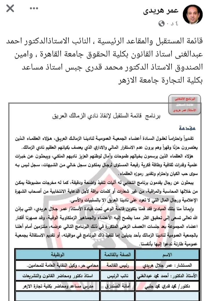 أعلن عمر هريدي، عضو مجلس إدارة نادي الزمالك السابق، والمرشح على منصب رئاسة القلعة البيضاء فى الانتخابات المقبلة، عن تفاصيل قائمته الانتخابية.