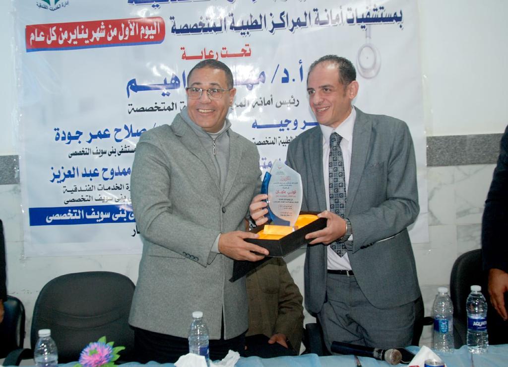 وأضاف الدكتور صلاح جودة، أن الحفل شهد تكريم عدد من رموز العمل الأهلي في بني سويف الداعمين للمؤسسات الصحية، ومنهم الكابتن تونى عثمان، الذي يشغل منصب مدير إدارة العلاقات بشركة تيتان للأسمنت، ممثلا عن الشركة التي قدمت الدعم للمستشفى العام الماضي يتمثل في أجهزة طبية بما يوازي ٧ ملايين جنيه؛ لتطوير أقسام الطوارئ والحضانات والرعايات.