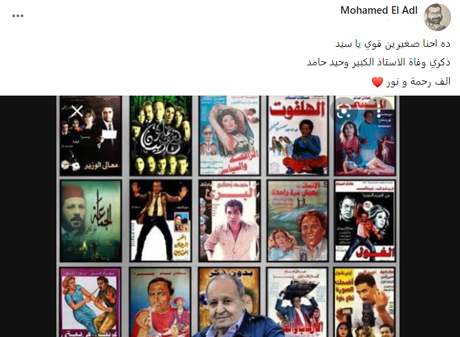 وكتب ماندو العدل منشورًا، عبر حسابه الشخصي بموقع التواصل الاجتماعي فيس بوك، قال فيه: ده إحنا صغيرين أوي يا سيد، ذكرى وفاة الأستاذ وحيد حامد.. ألف رحمة ونور عليه.