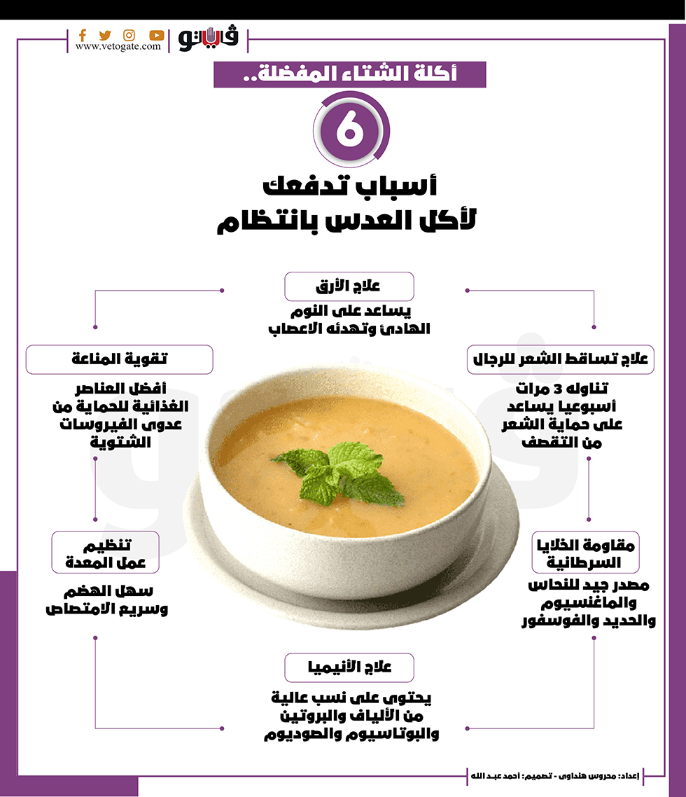 أكلة الشتاء المفضلة.. 6 أسباب تدفعك لأكل العدس بانتظام | انفوجراف الأحد 02/يناير/2022 - 08:24 م 1/2/2022 8:24:55 PM أكلة الشتاء المفضلة شارك طباعة 18 حجم الخط شارك طباعة