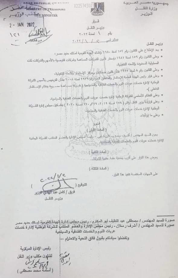 وجاء نص القرار انه بعد الاطلاع على القانون رقم 152 لسنة 1980 والخاص بالسكك الحديدية والقانون رقم 159 لسنة 1981 والخاص بإنشاء شركة عربات النوم وبعد الاطلاع على لائحة النظام الاساسى لشركة عربات النوم وعلى كافة اللوائح وغيرها قرر وزير النقل تعيين المهندس أشرف محمد رسلان رئيسا للشركة الوطني لعربات النوم والعضو المنتدب للشركة الوطنية لادارة عربات النوم.