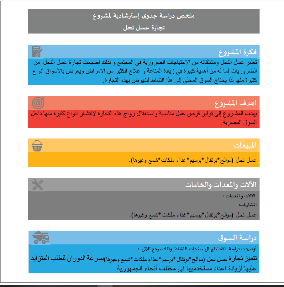 وتستعرض "فيتو" كافة التفاصيل المتعلقة بدراسة جدوي استرشادية لمشروع لتجارة عسل النحل والتي أعدها جهاز تنمية المشروعات الصغيرة والمتوسطة خلال السطور التالية: