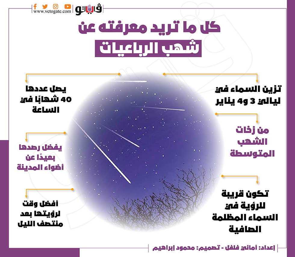 كل ما تريد معرفته عن شهب الرباعيات | انفوجراف الإثنين 03/يناير/2022 - 10:43 م 1/3/2022 10:43:21 PM شهب الرباعيات أماني فلفل شارك طباعة 18 حجم الخط شارك طباعة شهب شهب الرباعيات أفضل فترة لرصد شهب التوأميات شهب