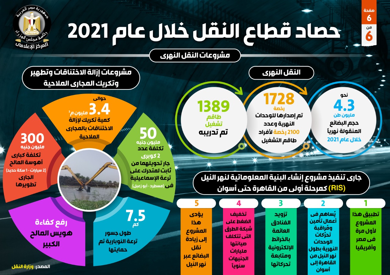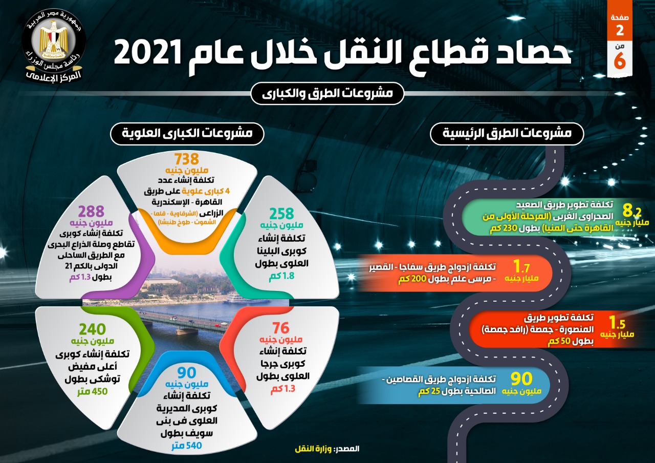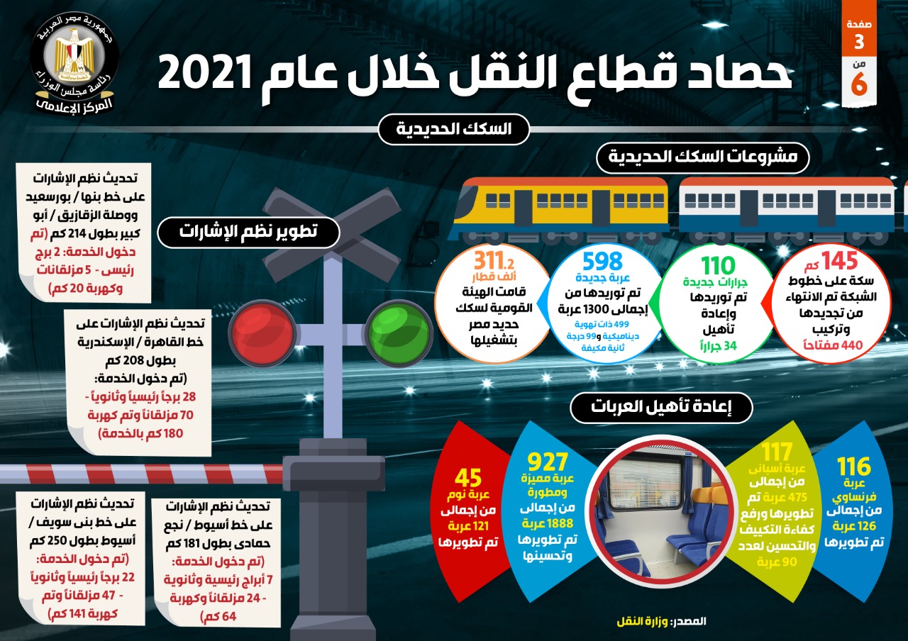 وفي إطار سلسلة تقارير حصاد قطاعات الدولة في عام 2021، نشر المركز الإعلامي لمجلس الوزراء تقريرًا تضمن إنفو جرافات تسلط الضوء على حصاد قطاع النقل.