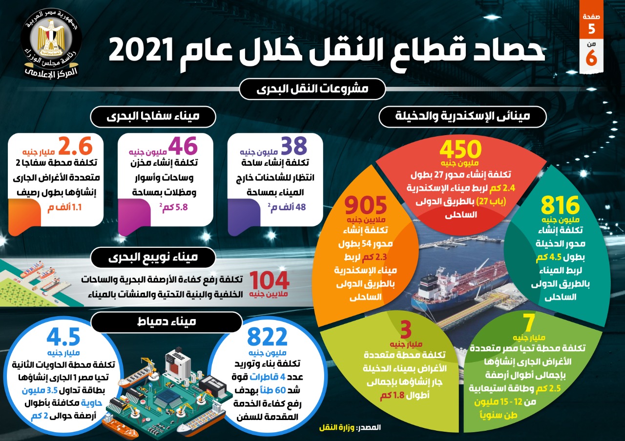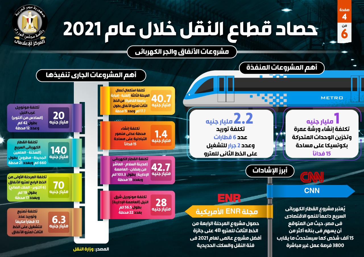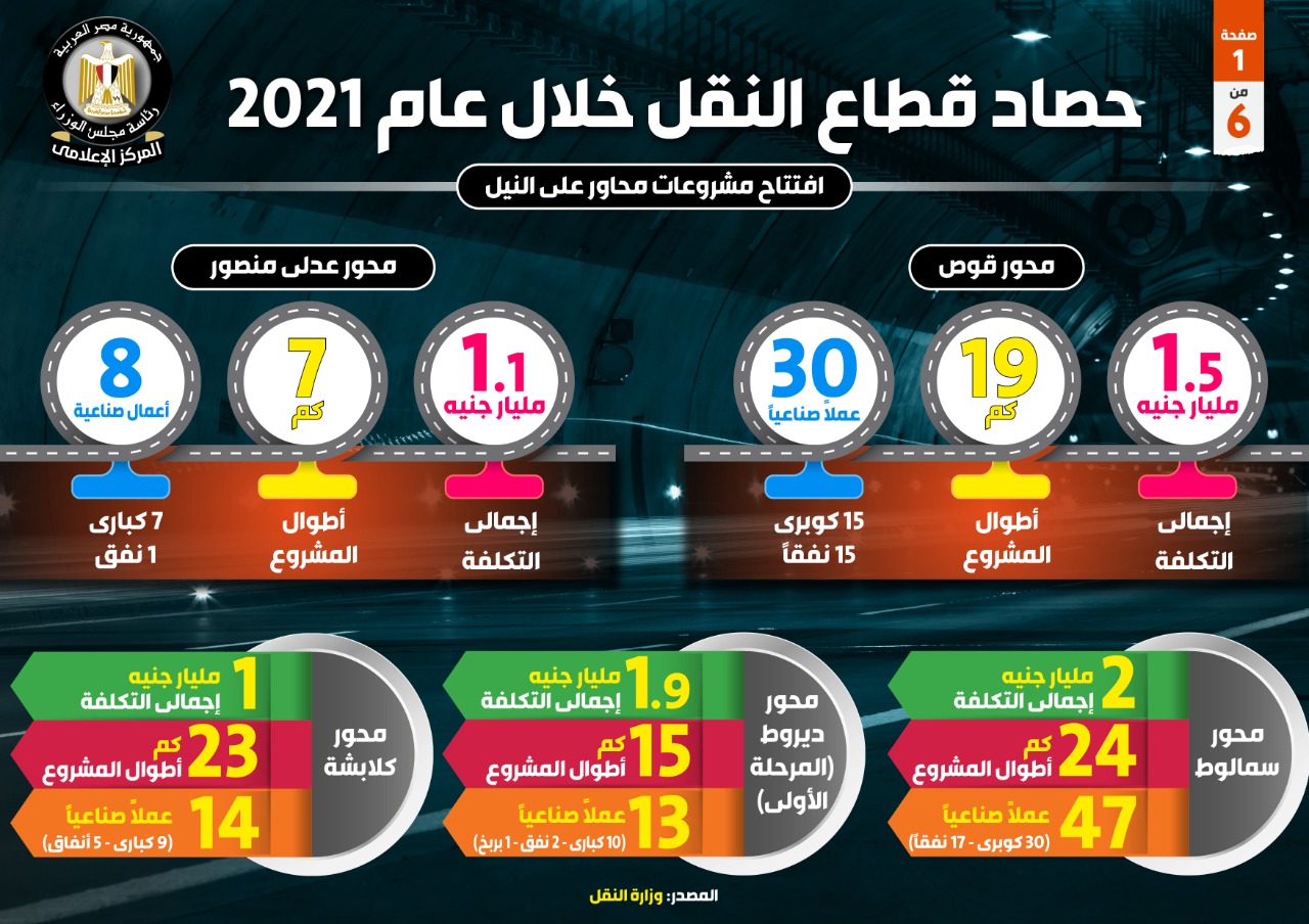 وفي إطار سلسلة تقارير حصاد قطاعات الدولة في عام 2021، نشر المركز الإعلامي لمجلس الوزراء تقريرًا تضمن إنفو جرافات تسلط الضوء على حصاد قطاع النقل.