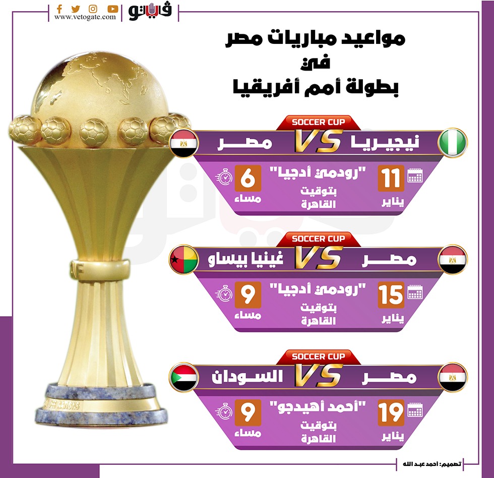 مواعيد مباريات مصر في بطولة أمم أفريقيا | انفوجراف الإثنين 03/يناير/2022 - 12:12 م 1/3/2022 12:12:15 PM مواعيد مباريات مصر في بطولة أمم أفريقيا رضا عبدالنبى شارك طباعة 18 حجم الخط شارك طباعة