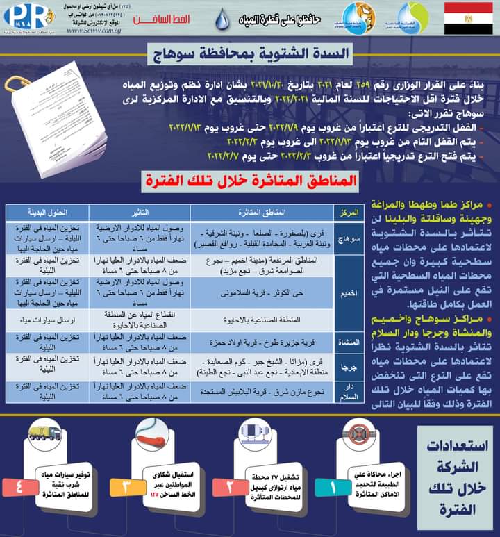 ومن الجدير بالذكر أن مراكز طما وطهطا والمراغة وجهينة وساقلتة والبلينا لن تتأثر بالسدة الشتوية لاعتمادها على محطات مياه سطحية كبيرة وان جميع محطات المياه السطحية التي تقع على النيل مستمرة في العمل بكامل طاقتها.