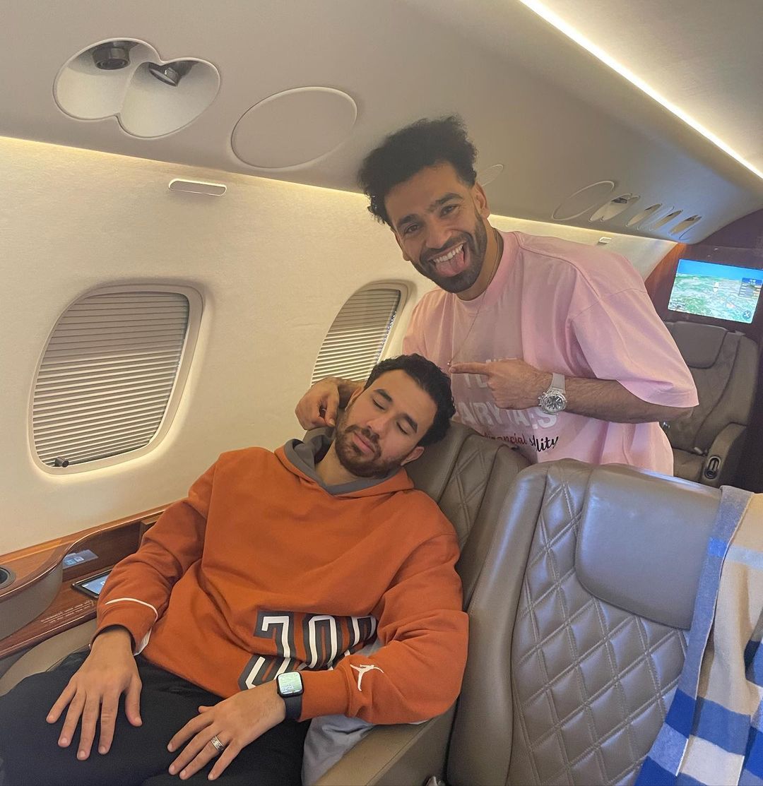 ظهر محمد صلاح، نجم المنتخب المصري ونادي ليفربول الإنجليزي، في صورة طريفة مع اللاعب محمود تريزيجيه، أثناء تواجدهما في الطائرة خلال رحلتهما من بريطانيا إلى القاهرة اليوم الإثنين.