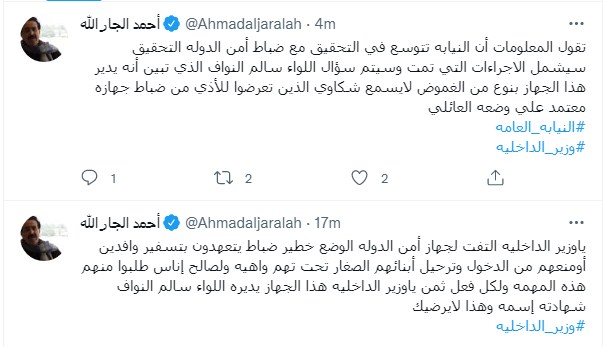 وكتب أحمد الجار الله تغريدة على تويتر "ياوزير الداخليه التفت لجهاز أمن الدولة الوضع خطير ضباط يتعهدون بتسفير وافدين أو منعهم من الدخول وترحيل أبنائهم الصغار تحت تهم واهية ولصالح أناس طلبوا منهم هذه المهمة ولكل فعل ثمن ياوزير الداخليه هذا الجهاز يديره اللواء سالم النواف شهادته إسمه وهذا لا يرضيك".