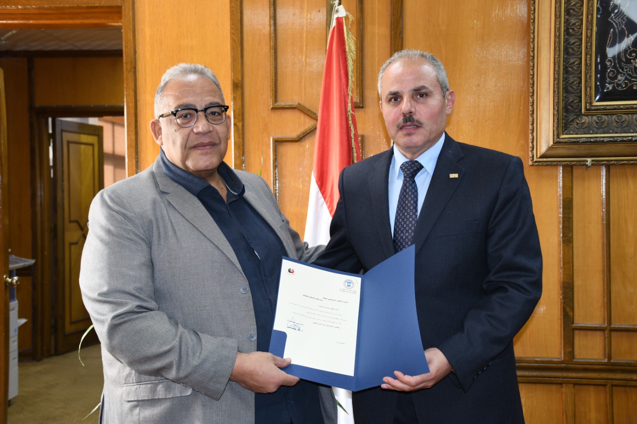 حيث استقبل رئيس الجامعة الدكتور أيمن جمعة لتسليمه القرار متمنيا له التوفيق والسداد.