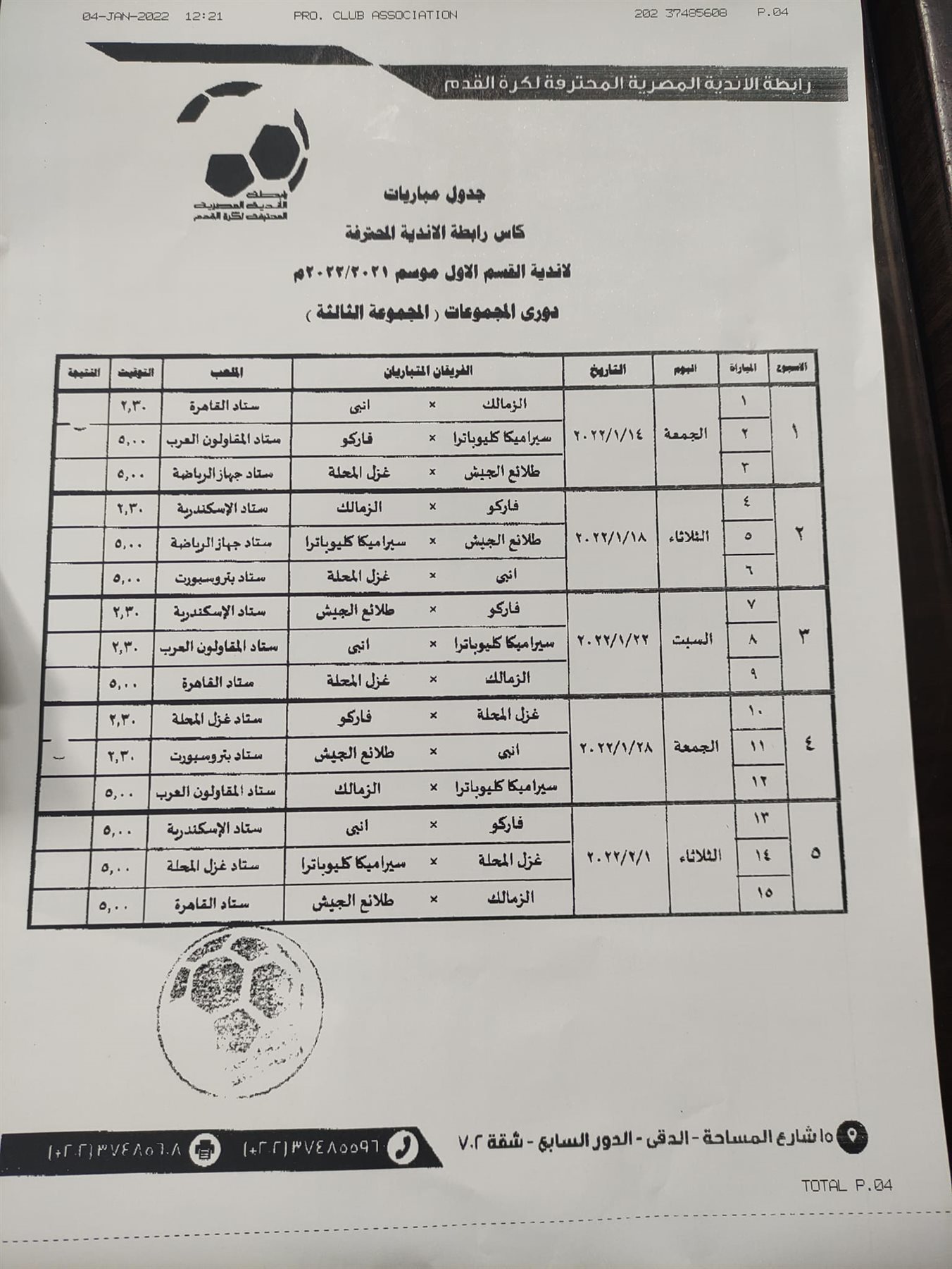 المجموعة الثالثة: الزمالك - إنبي - طلائع الجيش - غزل المحلة - سيراميكا كليوباترا - فاركو
