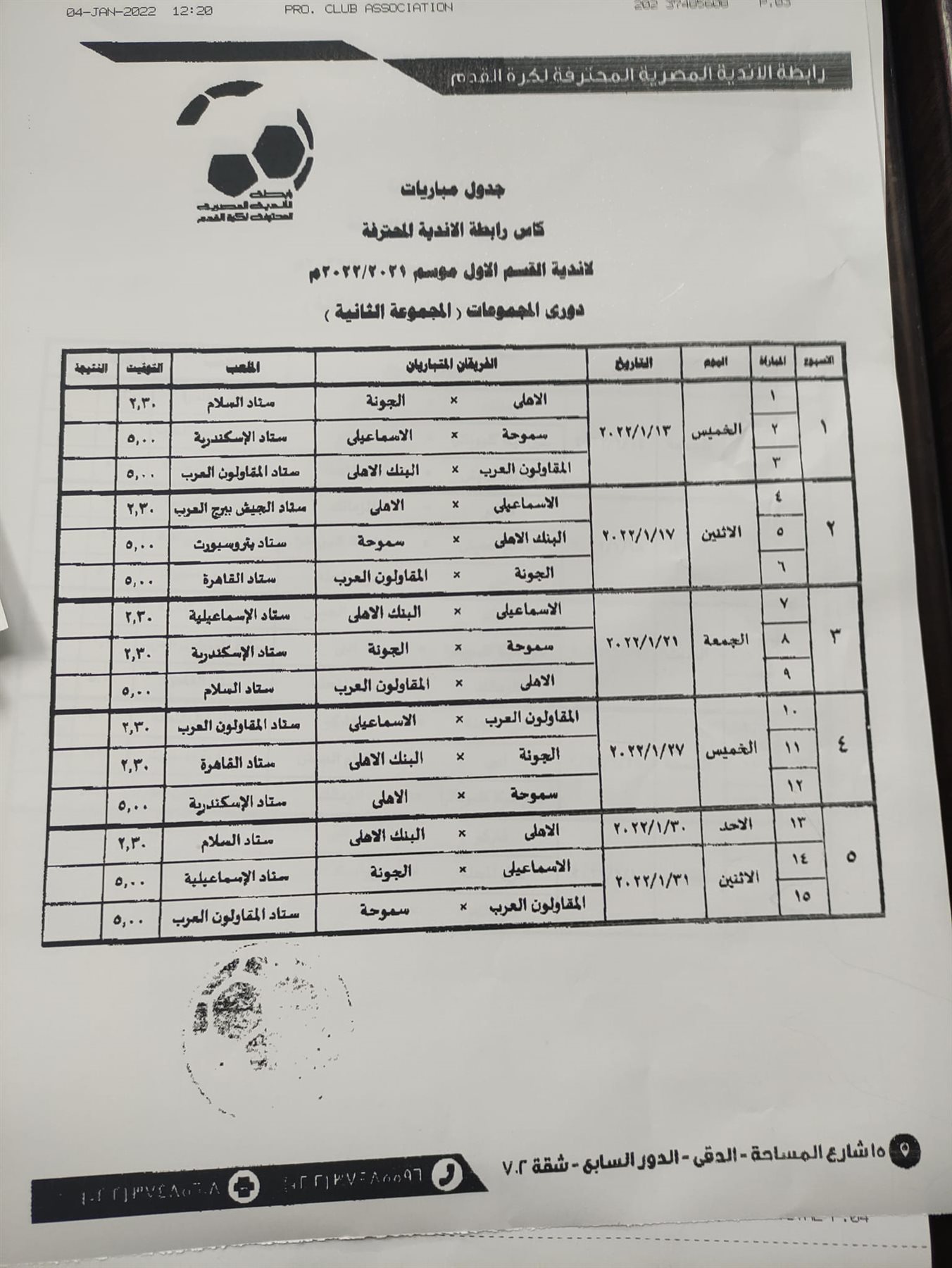 المجموعة الثانية: الأهلي - المقاولون العرب - البنك الأهلي - الجونة - سموحة - الإسماعيلي