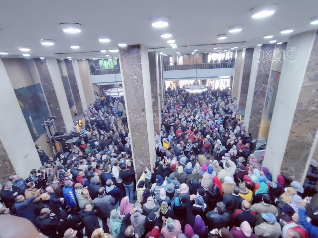 واحتشد الموظفون بإعداد كبيرة في بهو المبنى العتيق مرددين الهتافات التي تطالب بحقوقهم رغم وجود كميات كبيرة من المياه في أرضية المكان الذي شهد احتجاجات العاملين منذ يومان.