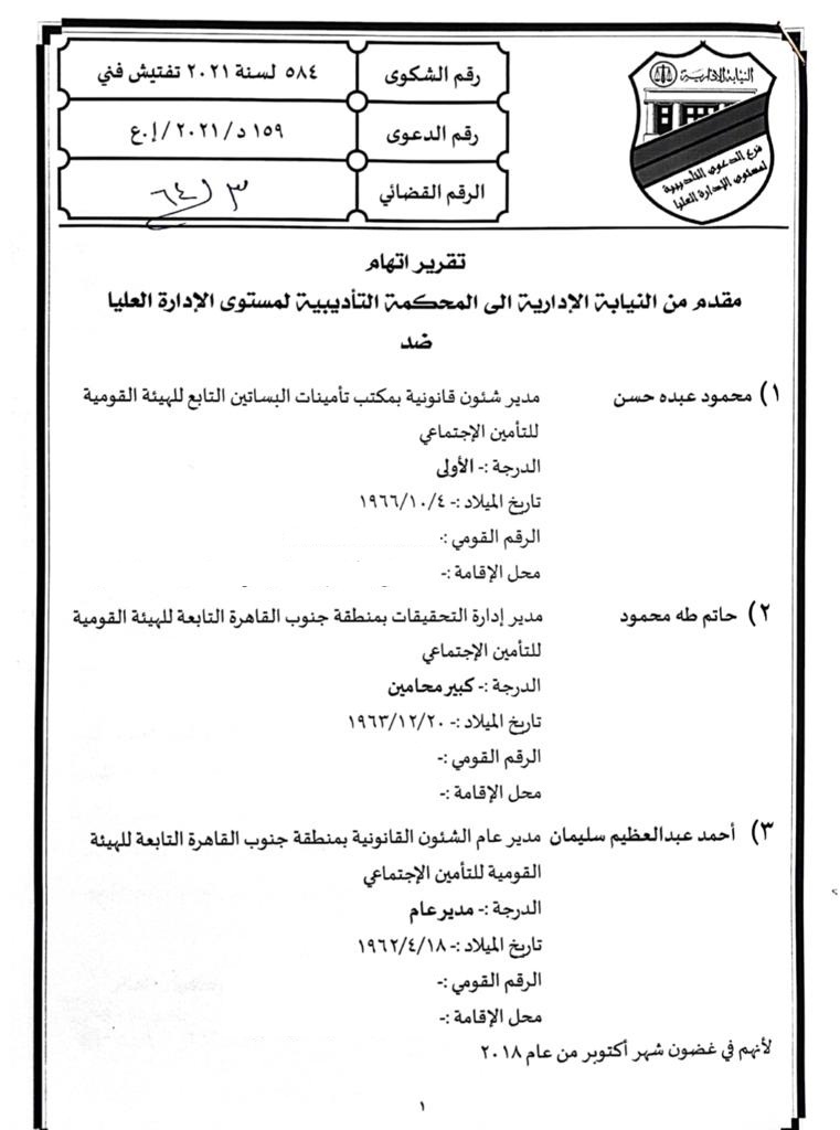 قررت وزارة العدل في القضية رقم 3 لسنة 64 قضائية عليا إحالة مدير عام الشئون القانونية بمنطقة جنوب القاهرة التابعة للهيئة القمية للتأمين الاجتماعي ومدير إدارة التحقيقات والمدير القانوني بمكتب تأمينات البساتين للمحاكمة التأديبية العاجل بعد ثبوت ارتكابهم مخالفات إدارية وقانونية