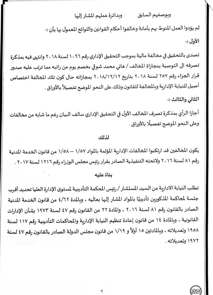 وأنتهت التحقيقات إلى إحالة المخالفين الثلاثة للمحاكمة العاجلة لإرتكابهم مخالفات إدارية منصوص عليها في المواد أرقام 57/1 و58/1 من قانون الخدمة المدنية رقم 81 لسنة 2016 ولائحته التنفيذية الصادرة بقرار رئيس مجلس الوزراء رقم 1216 لسنة 2017