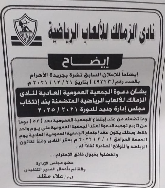 نشر نادي الزمالك في جريدة الأهرام الصادرة غدًا إيضاحًا جديدًا بخصوص موعد الانتخابات المقبلة حيث يؤكد الإعلان بأن موعد الجمعية العمومية سيكون يوم الجمعة 11 فبراير المقبل على يوم واحد.