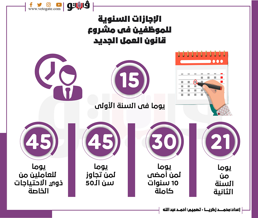 الإجازات السنوية للموظفين فى مشروع قانون العمل الجديد | إنفوجراف الأربعاء 05/يناير/2022 - 09:14 م 1/5/2022 9:14:19 PM الإجازات السنوية للموظفين فى مشروع قانون العمل الجديد محمد زكريا شارك طباعة 18 حجم الخط شارك طباعة مجلس الشيوخ قانون العمل قانون العمل الجديد ذوي الاعاقة الاجازات العمل