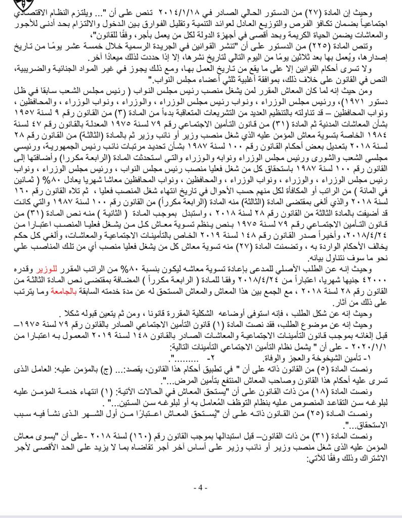 واستطرد الوزراء السابقون "المدعون" أنه وبعد رفض الهيئة القومية للتأمين الإجتماعي لطلباتهم بصرف المعاش المقرر لكل منهم باعتباره وزيرا سابقا وفقًا للقانون الأخير، أقاموا دعاوى قضائية أمام مجلس الدولة ضد وزير المالية ورئيس مجلس إدارة الهيئة القومية للتأمين الاجتماعي بصفتيهما لإلزام الهيئة المدعى عليها الثانية بمنحه كلًا منهم معاشا يعادل 80% من الراتب المقرر للوزير ومقداره 42000 جنيها ليكون المعاش مبلغ 33600 جنيها وذلك اعتبارًا من 24 / 4 / 2018 وما يترتب على ذلك من آثار.