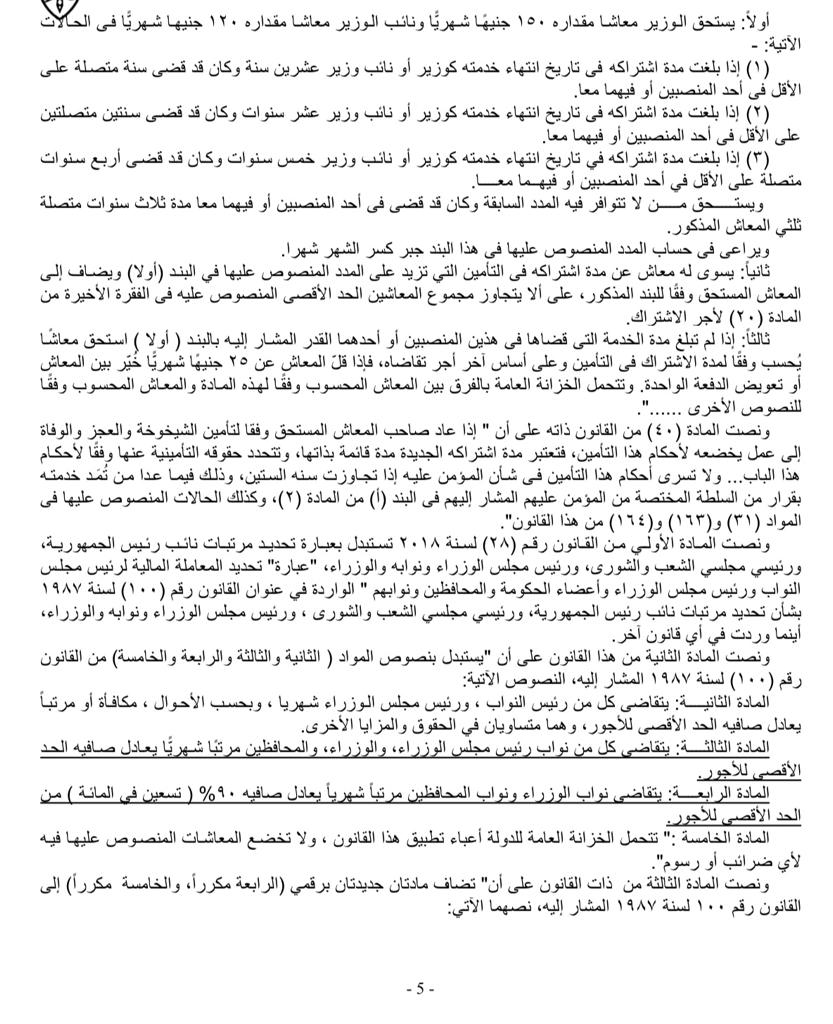 القانون ٢٨ لسنة ٢٠١٨ بتعديل بعض أحكام القانون رقم 100 لسنة ۱٩٨٧ بشأن تحدید مرتبات نائب رئيس الجمهورية، ورئيس مجلس الشعب والشورى ورئيس مجلس الوزراء ونوابه والوزراء يربك 56 وزيرًا ومحافظًا سابقًا بينهم 5 وزراء للتربية والتعليم و3 وزراء للسياحة ومثلهم للتعليم العالي، وبعض الوزراء المعينين من عام 1975 وخرجوا من الوزارة قبل صدور القانون الجديد، وطلبوا إلزام الهيئة القومية للتأمين الاجتماعي بمنح كل منهم معاشا يعادل 80% من الراتب المقرر للوزير، وبينهم أحد الوزراء السابقين لم يستمر في وظيفته سوى أسبوعين فقط وآخرون شغلوا وظيفة وزير أقل من ثلاثة أشهر، وبعضهم ترك الوزارة من الثمانينات والتسعينيات من القرن العشرين.