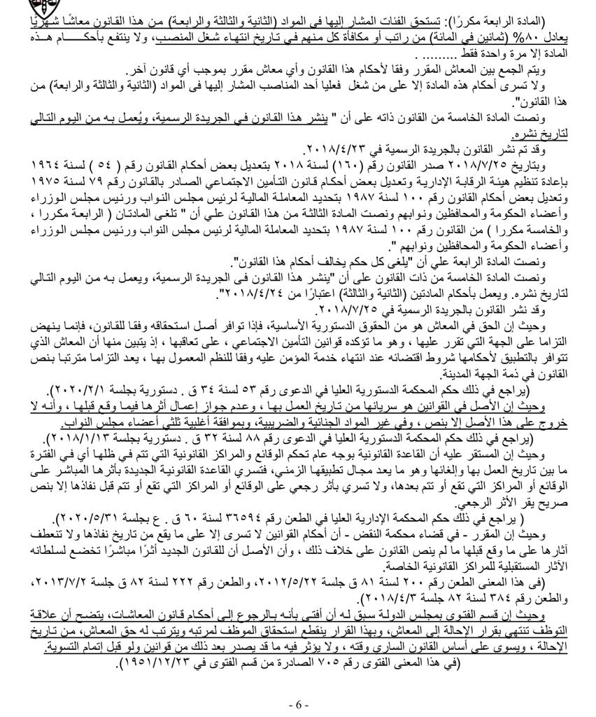 قالت المحكمة عبر 56 حكما قضائيا أن الأصل في القوانين هو سريانها من تاريخ العمل بها، وعدم جواز إعمال أثرها فيما وقع قبلها، والمشرع أعاد تنظيم الأحكام الواردة بمواد القانون رقم 28 لسنة 2018، وعمد بموجب المادة الثانية من القانون رقم 160 لسنة 2018 (والتي عمل بها اعتبارًا من 24/4/2018) إلى استبدال نص المادة (31) من قانون التأمين الاجتماعي رقم 79 لسنة 1975، بنص قرر بمقتضاه تسوية معاش كل من يشغل فعليا منصب رئيس مجلس النواب ورئيس مجلس الوزراء ونوابه والوزراء ونوابهم والمحافظين ونوابهم بواقع جزء من عشرة أجزاء من أجر التسوية عن كل سنة خدمة قضيت فيه من آخر مكافأة أو آخر راتب لشاغل المنصب وبما لا يجاوز صافي الحد الأقصى للأجور في تاريخ انتهاء شغل المنصب، أي كل من أدركه العمل بنص المادة (31) بعد استبدالها بالقانون رقم 160 لسنة 2018 اعتبارًا من 24/4/20183، وهو ما زال يشغل المنصب سالف الذكر فعليا.