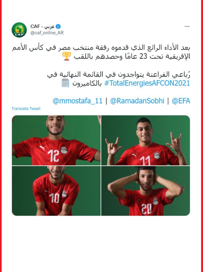 وقعت الصفحة الرسمية للاتحاد الأفريقي لكرة القدم “ كاف” عبر موقع التواصل الاجتماعي تويتر في خطأ كبير بعدما سلطت الصفحة الضوء على تواجد لاعبي المنتخب الأولمبي الحاصلين على كأس الأمم الأفريقية بمصر تحت 23 سنة عام 2019 بقيادة الكابتن شوقي غريب ضمن القائمة النهائية للفراعنة في الكاميرون 2022.