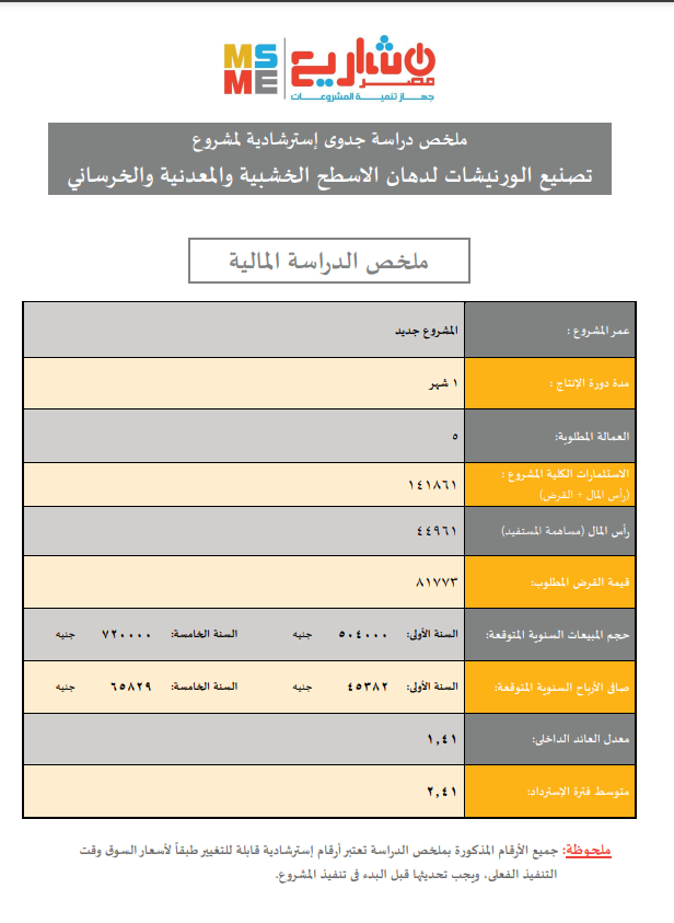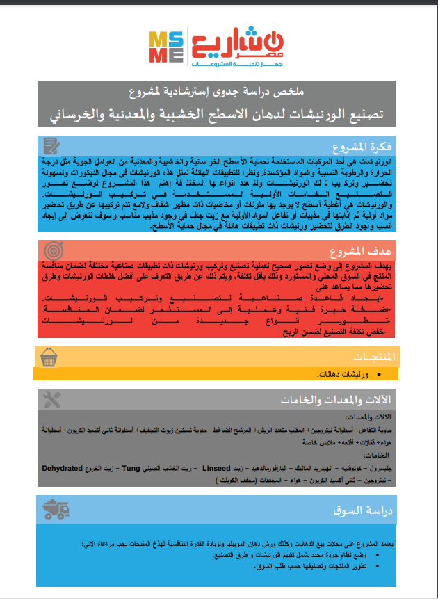 وتستعرض "فيتو" كافة التفاصيل المتعلقة بدراسة جدوى استرشادية لمشروع تصنيع الورنيشات لدهان الأسطح الخشبية والمعدنية والخرسانية، والتي أعدها جهاز تنمية المشروعات الصغيرة والمتوسطة خلال السطور التالية: