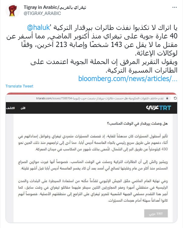 وكتبت تيجراي بالعربي تغريدة على تويتر قائلة: "يا أتراك لا تكذبوا نفذت طائرات بيرقدار التركية ' 40 غارة جوية على تيجراي منذ أكتوبر الماضي، مما أسفر عن مقتل ما لا يقل عن 143 شخصًا وإصابة 213 آخرين، وفقًا لوكالات الإغاثة. ويقول التقرير المرفق إن الحملة الجوية اعتمدت على الطائرات المسيرة التركية".