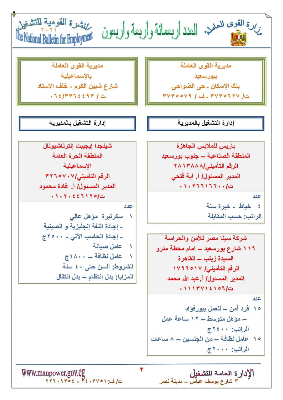 وفي شمال سيناء يوجد 2 معلم، و3 محاسب، و10 مندوب مبيعات، و4 أمين مخزن، و3 سائق رخصة اولى وثانية، و10 عامل عادي.