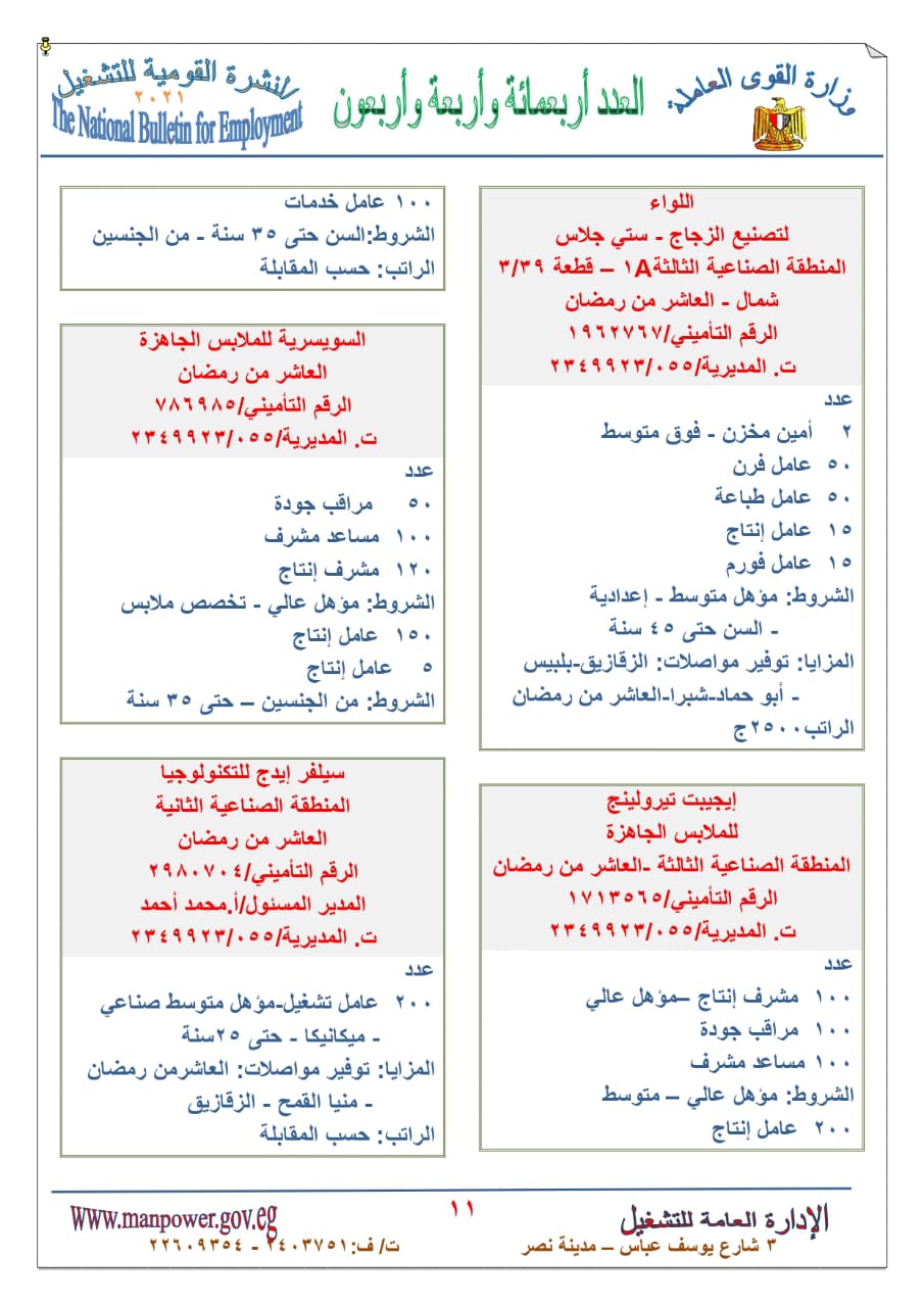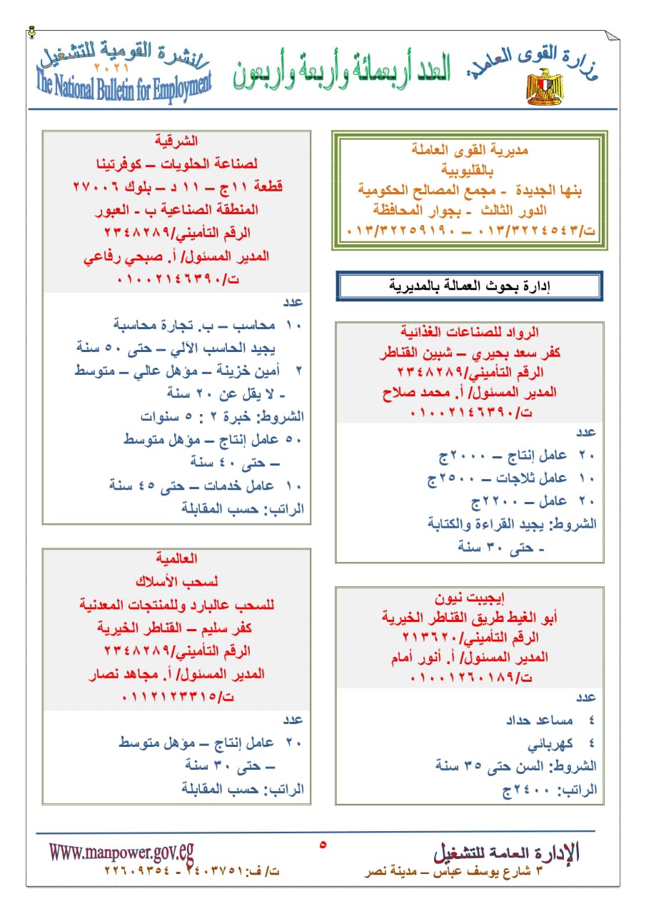 كما وفرت مديرية القوى العاملة بالقليوبية مجموعة من فرص العمل شملت: 10 محاسب يجيد الحاسب الآلي، و2 أمين خزينة، و90 عامل إنتاج، و40 عامل عادي، و10 عامل ثلاجات، و4 مساعد حداد، و4 كهربائي، و10 فرد أمن .