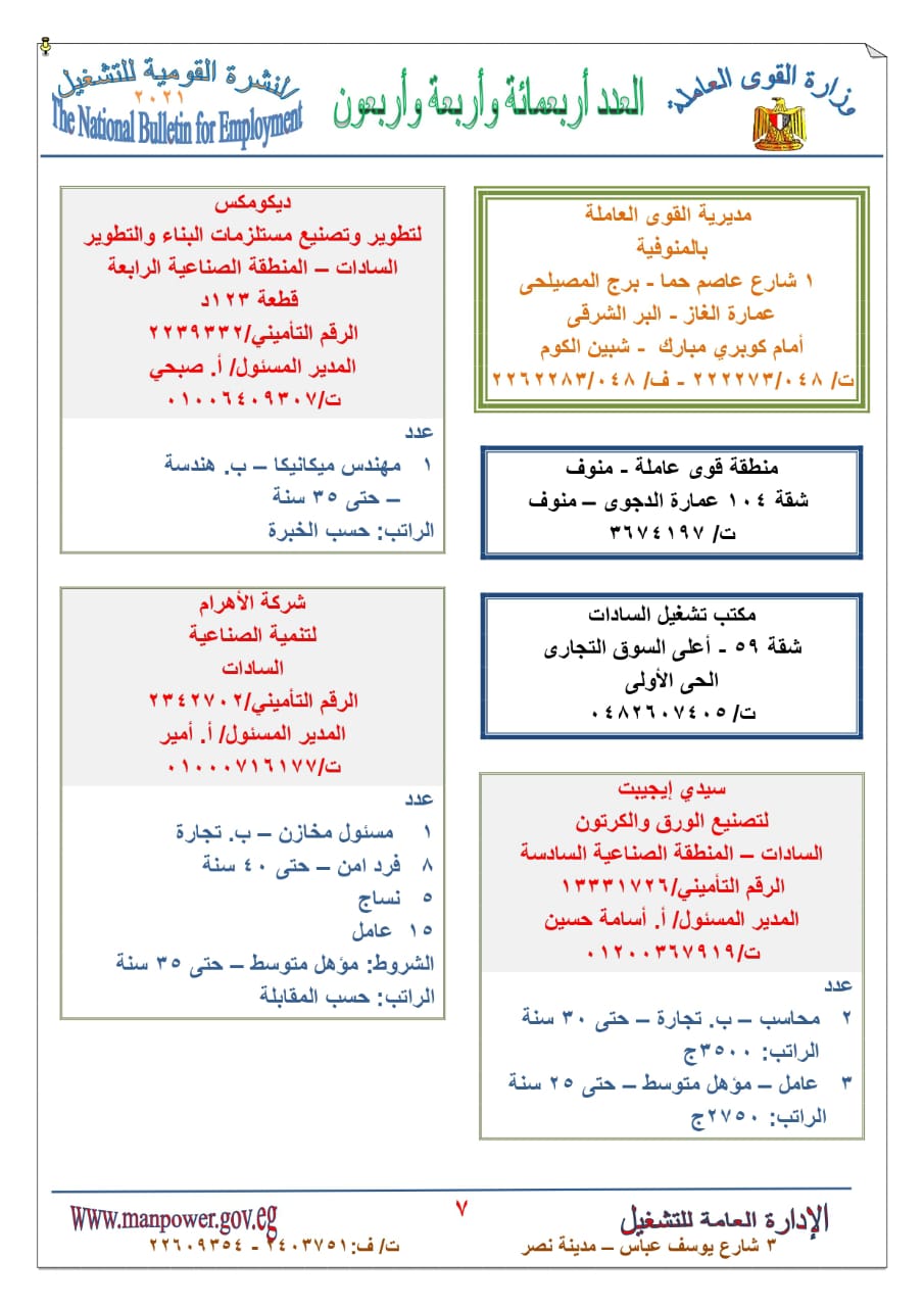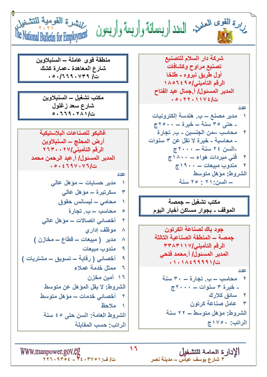 ووفرت مديرية القوى العاملة بالدقهلية فرص عمل شملت: مدير مصنع، و8 مدير مبيعات، ومدير حسابات، و9 محاسبين، ومحامين، و11 مندوب مبيعات، و2 فنى مبردات هواء، و2 أخصائي إتصالات، و9 أخصائي رقابة وتسويق، و6 ممثل خدمة عملاء، و8 موظف إداري، و3 عامل خياطة، و3 عامل تشطيب، و3 عمال لمصنع حلوي، و2 سائق كلارك، و2 عامل صناعة كرتون، و16 أمين مخزن، و2 اخصائي خدمات، وملاحظ .