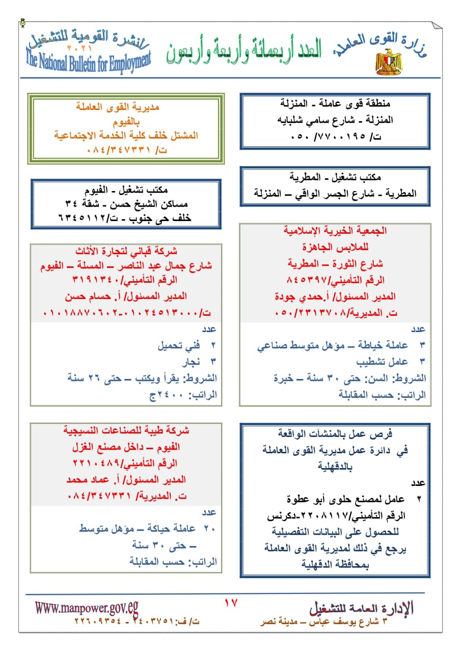 وفي الفيوم يوجد 149 فرصة عمل متاحة، منها:100 فرد أمن، و12 شيف فرن، و3 نجار، و2 فنى تحميل، و20 عامل خياطة، و2 كاشير، و4 ويتر، و4 ستيوارد .