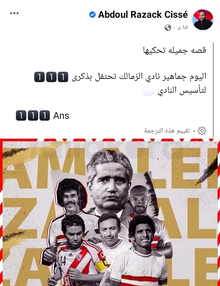 احتفل رزاق سيسيه لاعب الفريق الأول لكرة القدم بنادي الزمالك، بمرور 111 سنة على تأسيس القلعة البيضاء.